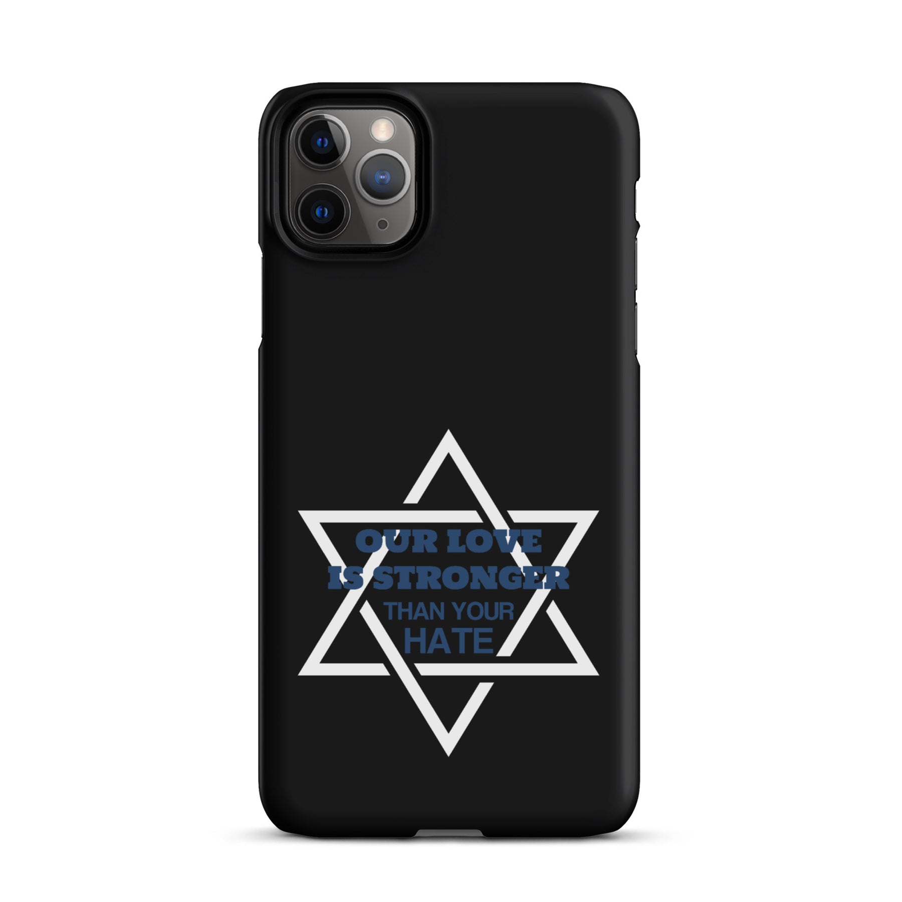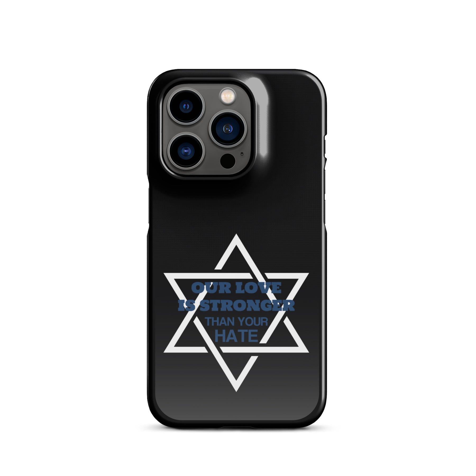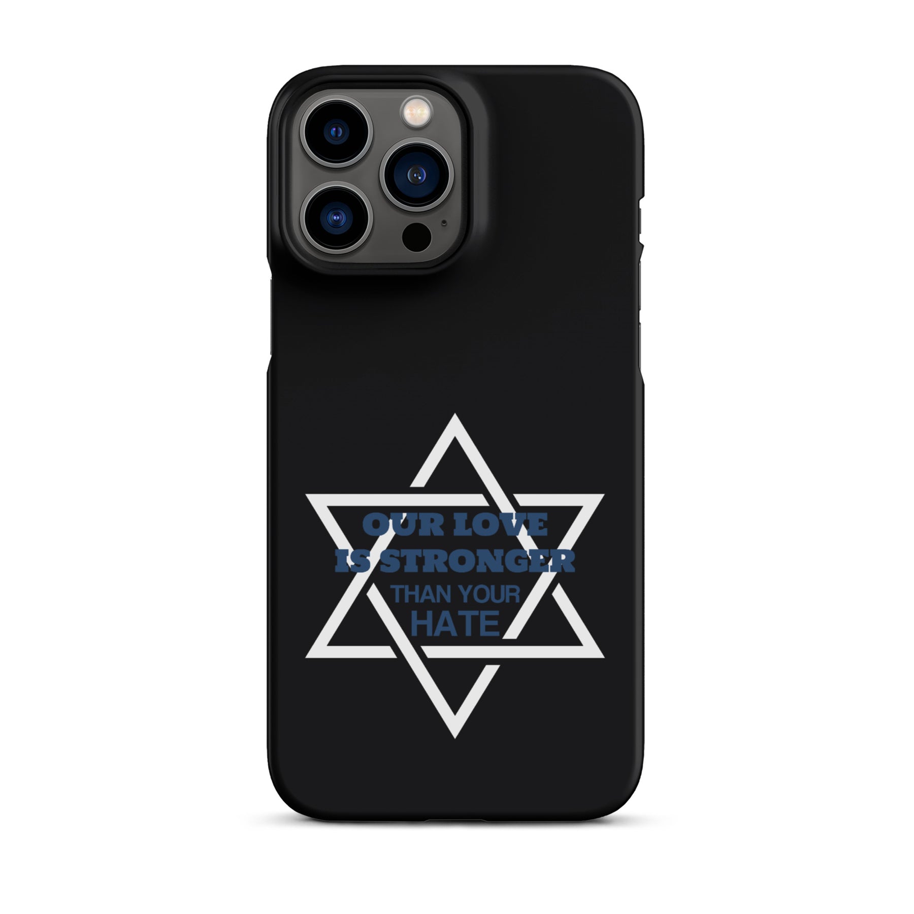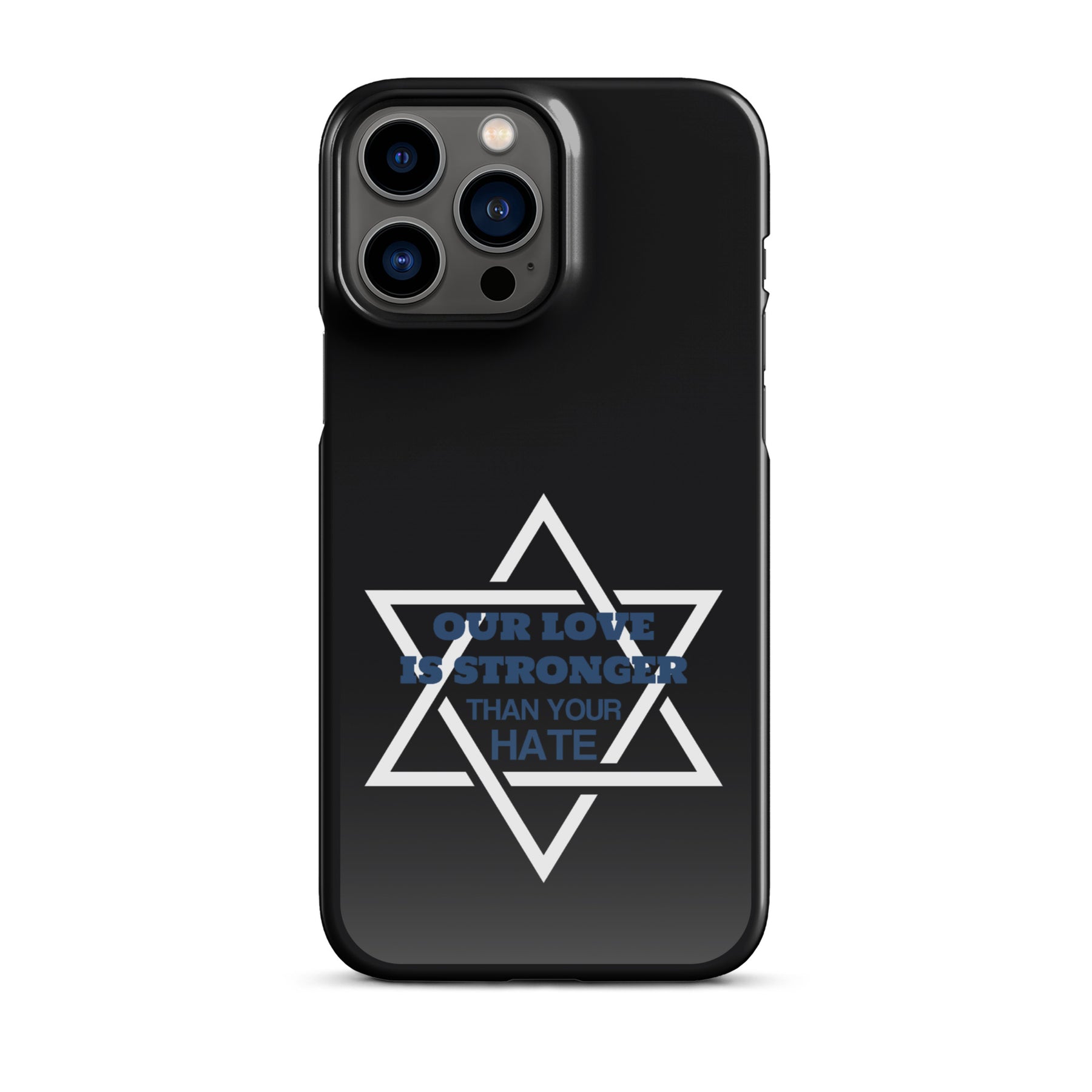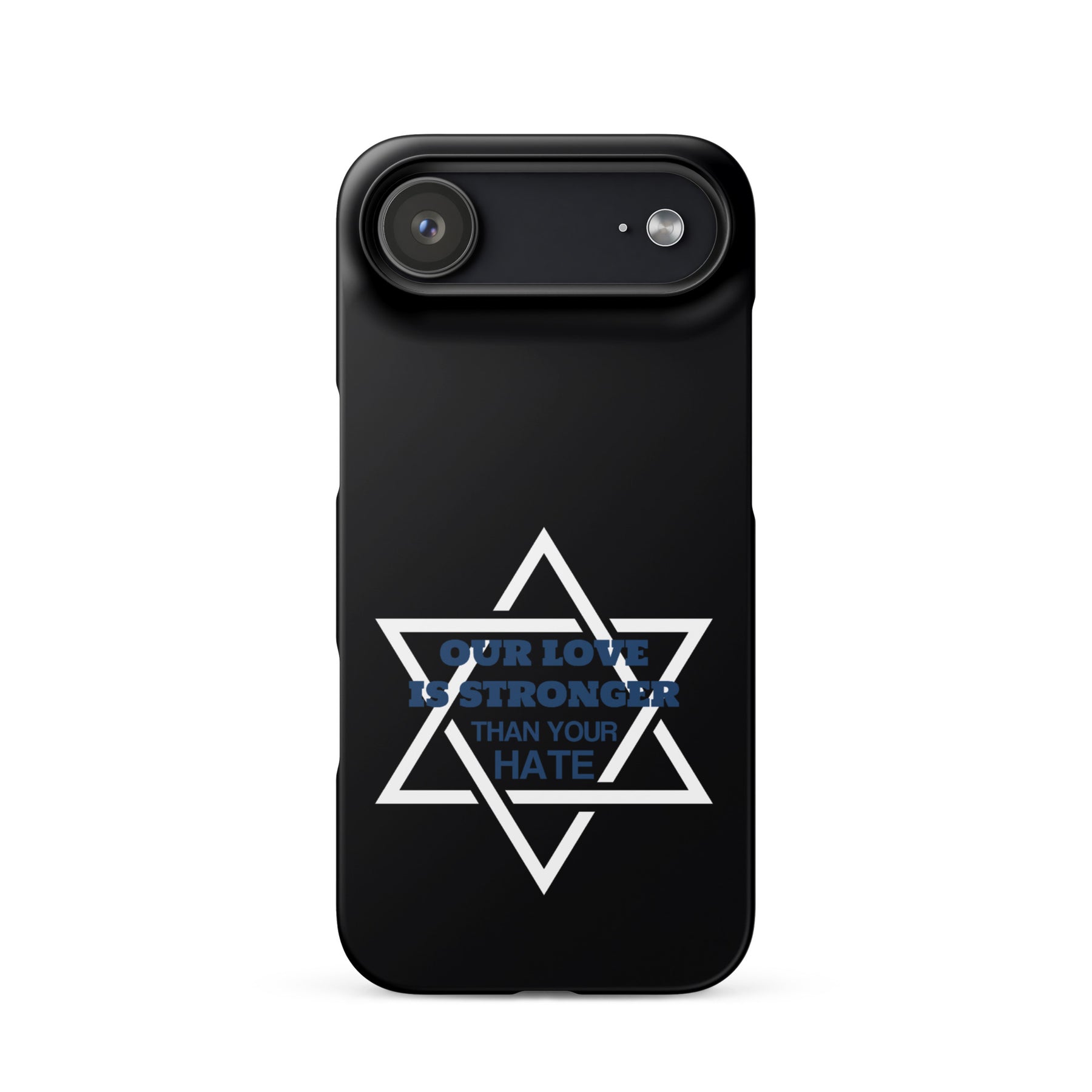 Carry a message of unity and resilience with every call, text, or selfie. The “Our Love Is Stronger Than Your Hate” snap case for iPhone® is a bold declaration of Jewish strength, pride, and love that rises above hate.