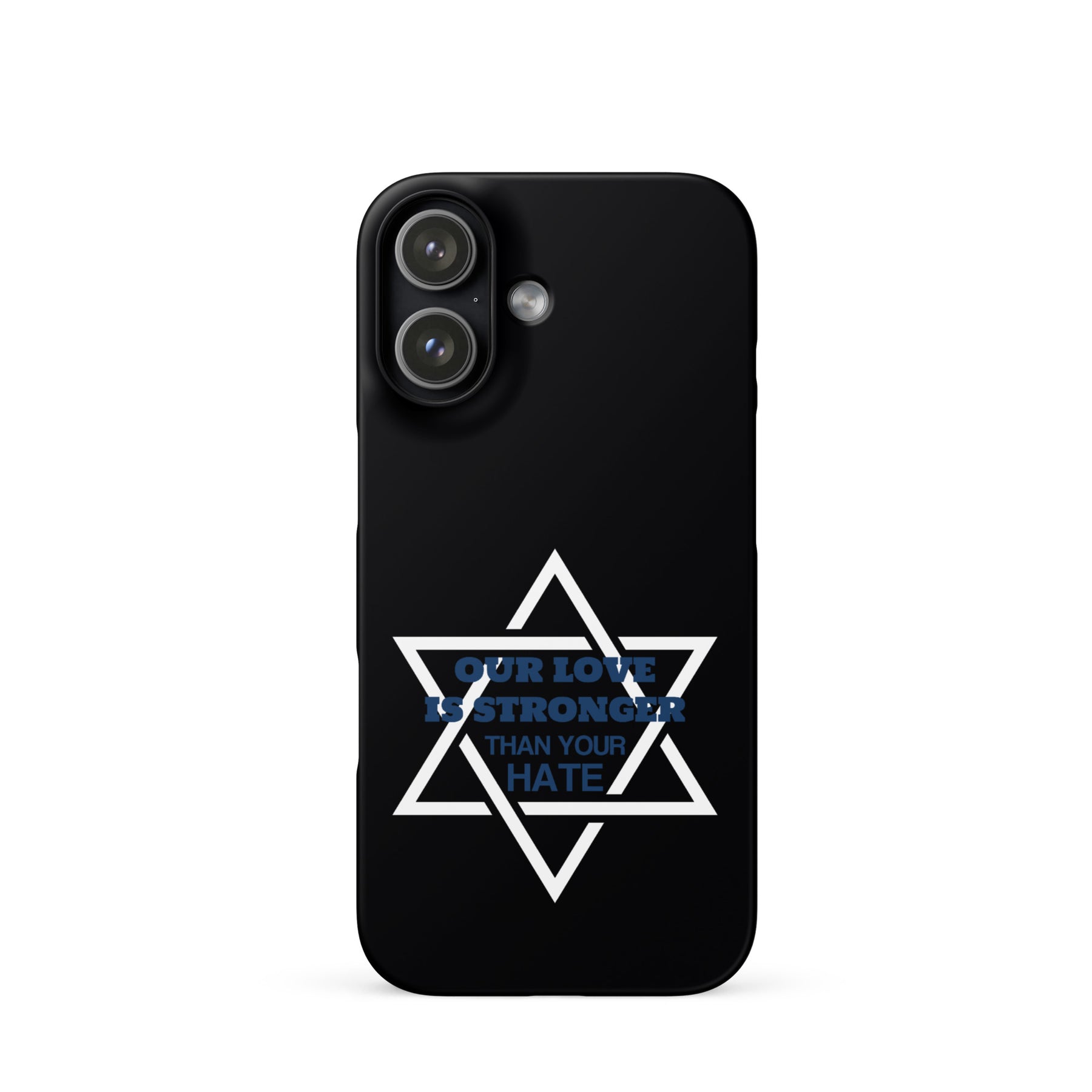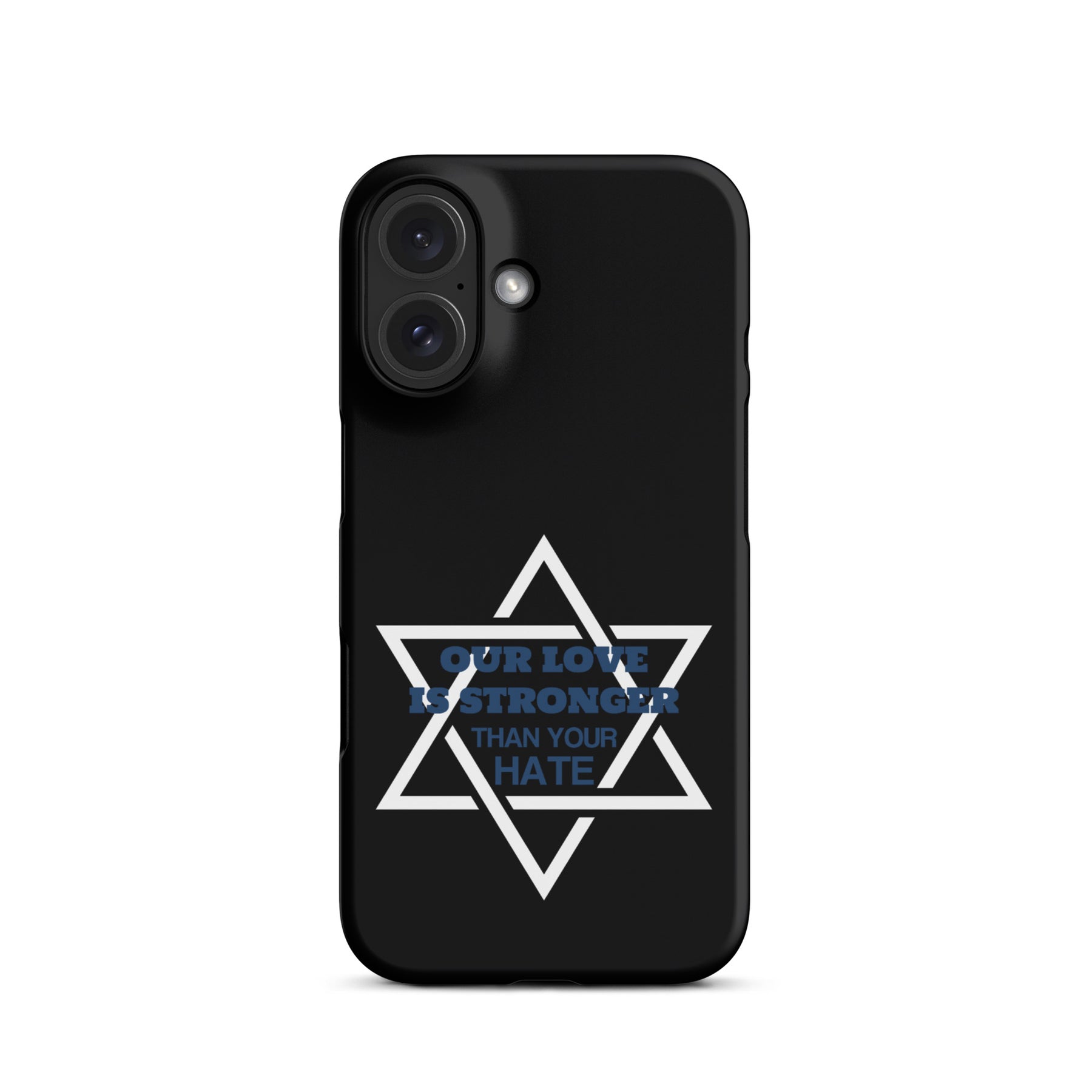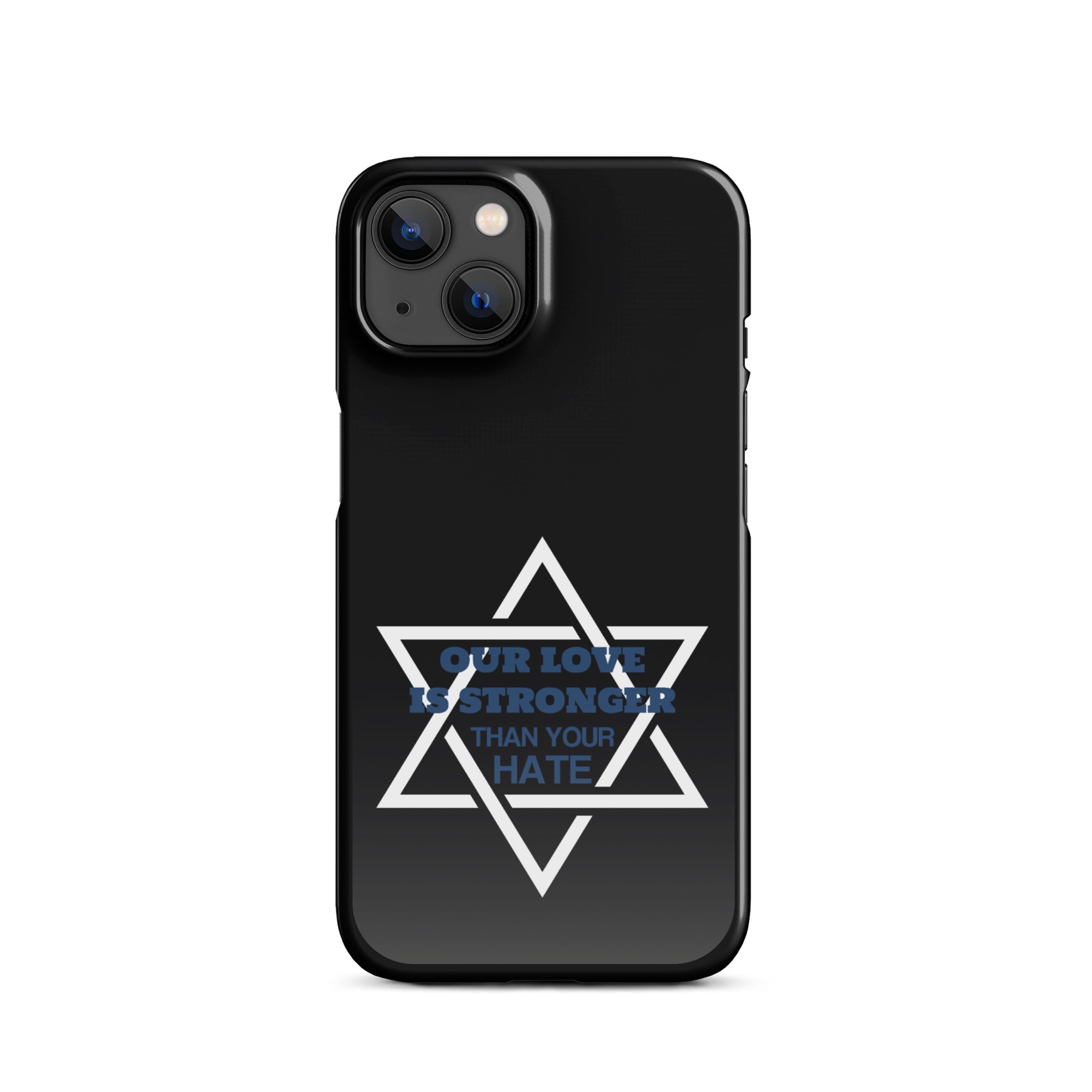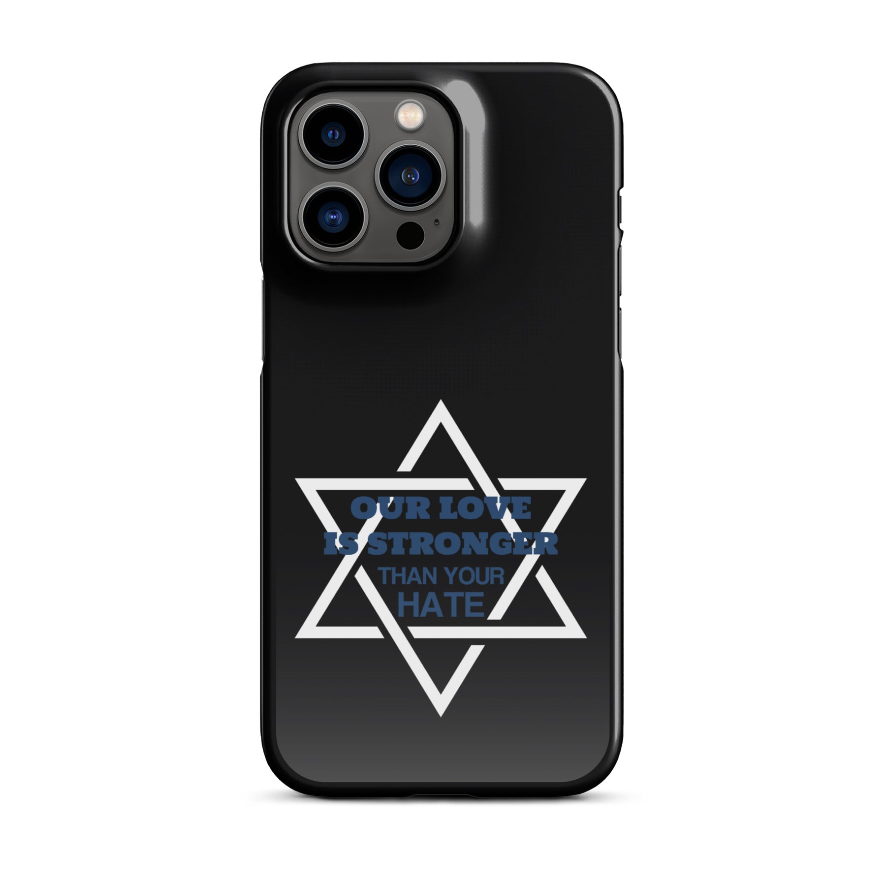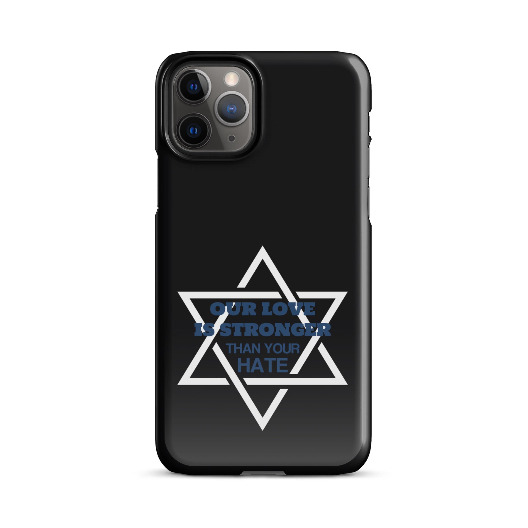 Carry a message of unity and resilience with every call, text, or selfie. The “Our Love Is Stronger Than Your Hate” snap case for iPhone® is a bold declaration of Jewish strength, pride, and love that rises above hate.