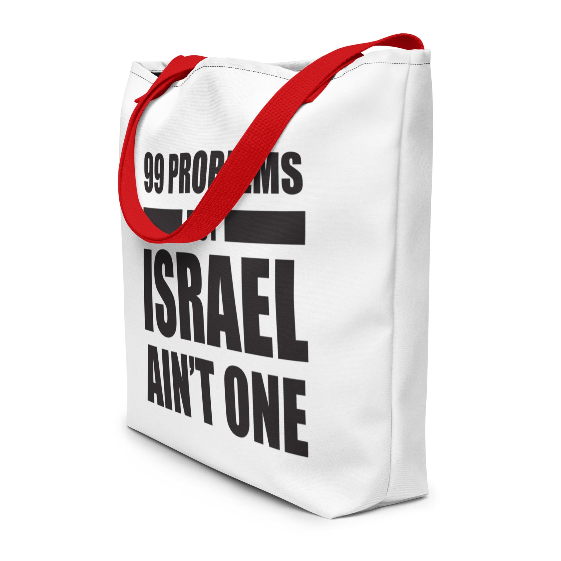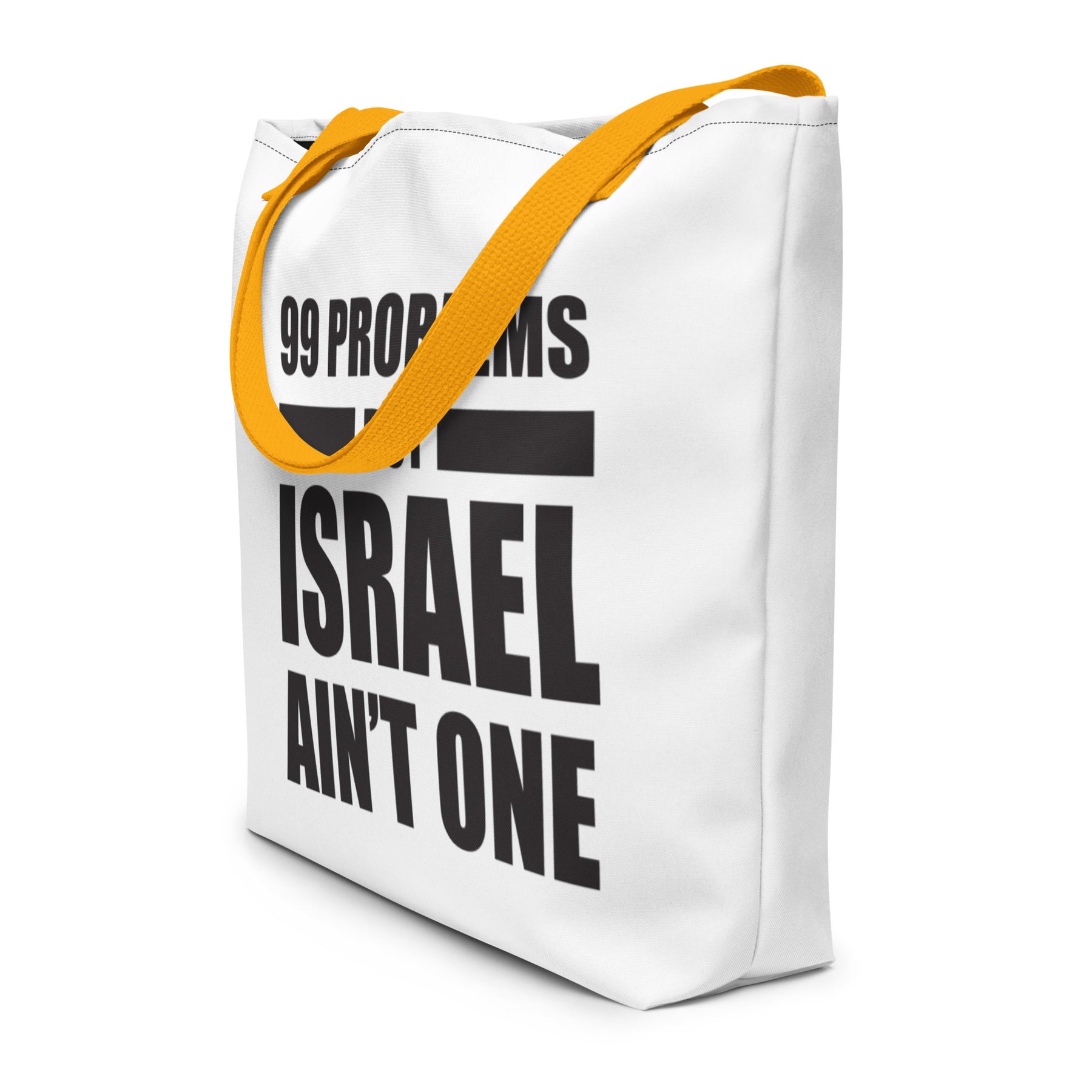 Make a bold statement wherever you go with the “99 Problems But Israel Ain’t One” Large Tote Bag — the perfect blend of Jewish pride, pro-Israel solidarity, and everyday practicality. This oversized bag isn’t just for carrying groceries, books, or protest gear — it carries your message loud and proud.