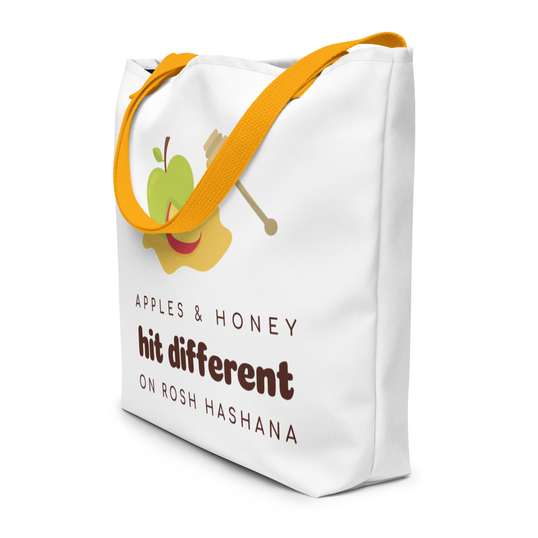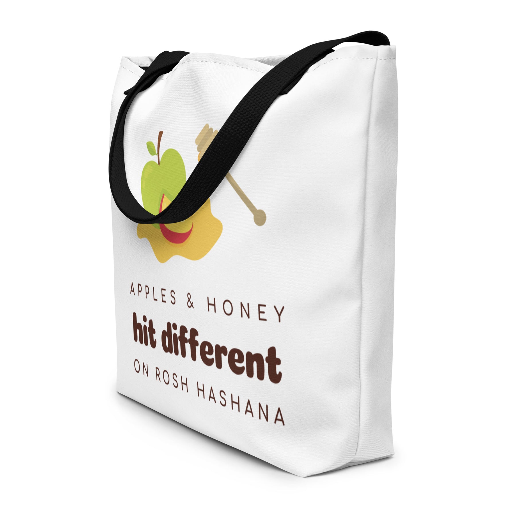Carry tradition in style with the Apples & Honey Large Tote Bag — your go-to for the High Holidays and beyond. Featuring a vibrant, symbolic design of apples and honey, this spacious bag celebrates Jewish heritage and the sweetness of Rosh Hashanah in a fresh, modern way.