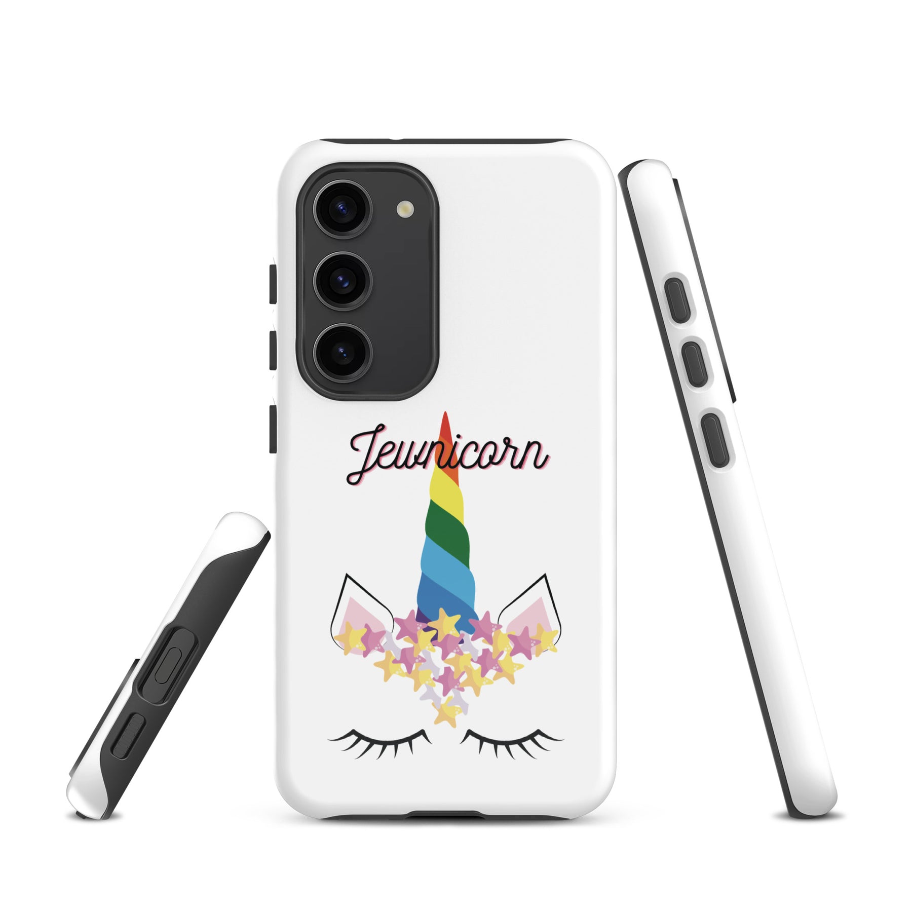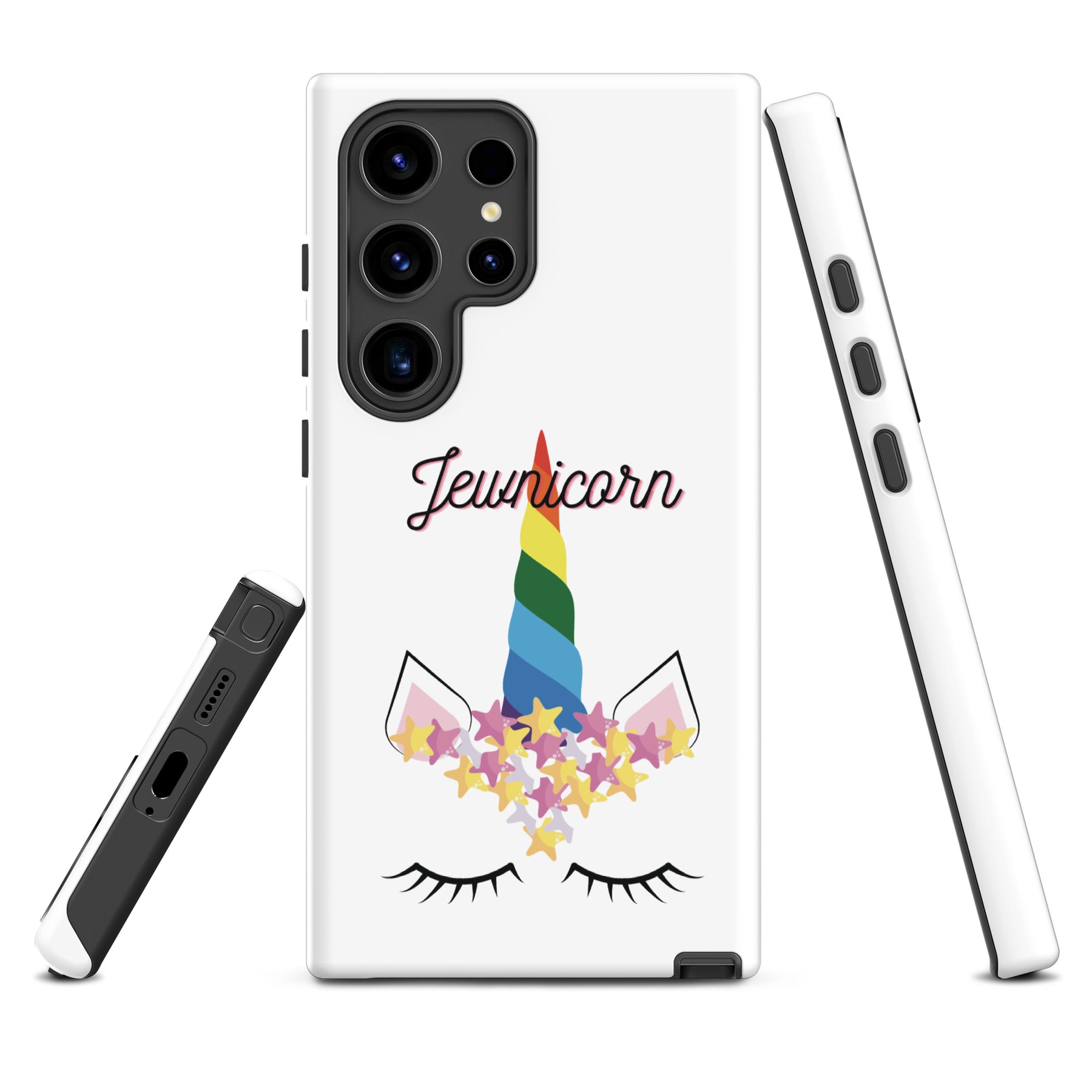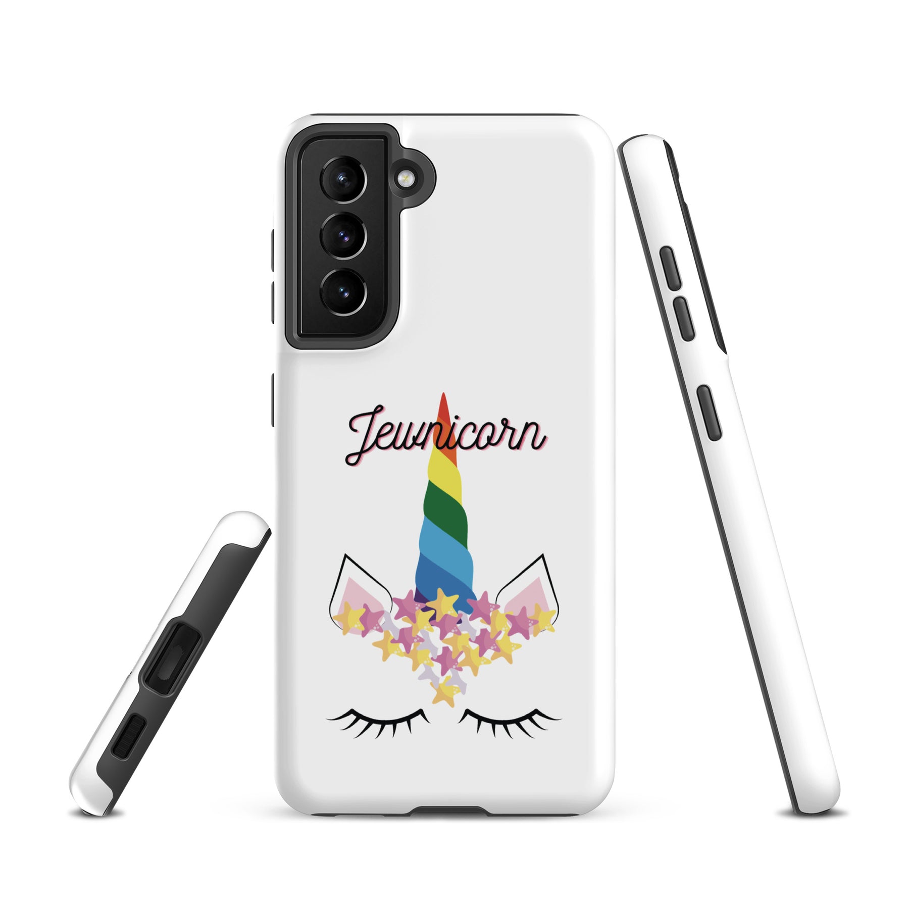 Give your Samsung phone real protection with a bright, cheerful twist. The Jewnicorn Tough Case features a sweet unicorn face with closed eyes, pastel stars, and a rainbow horn. It’s cute, colorful, and instantly adds personality to your phone.