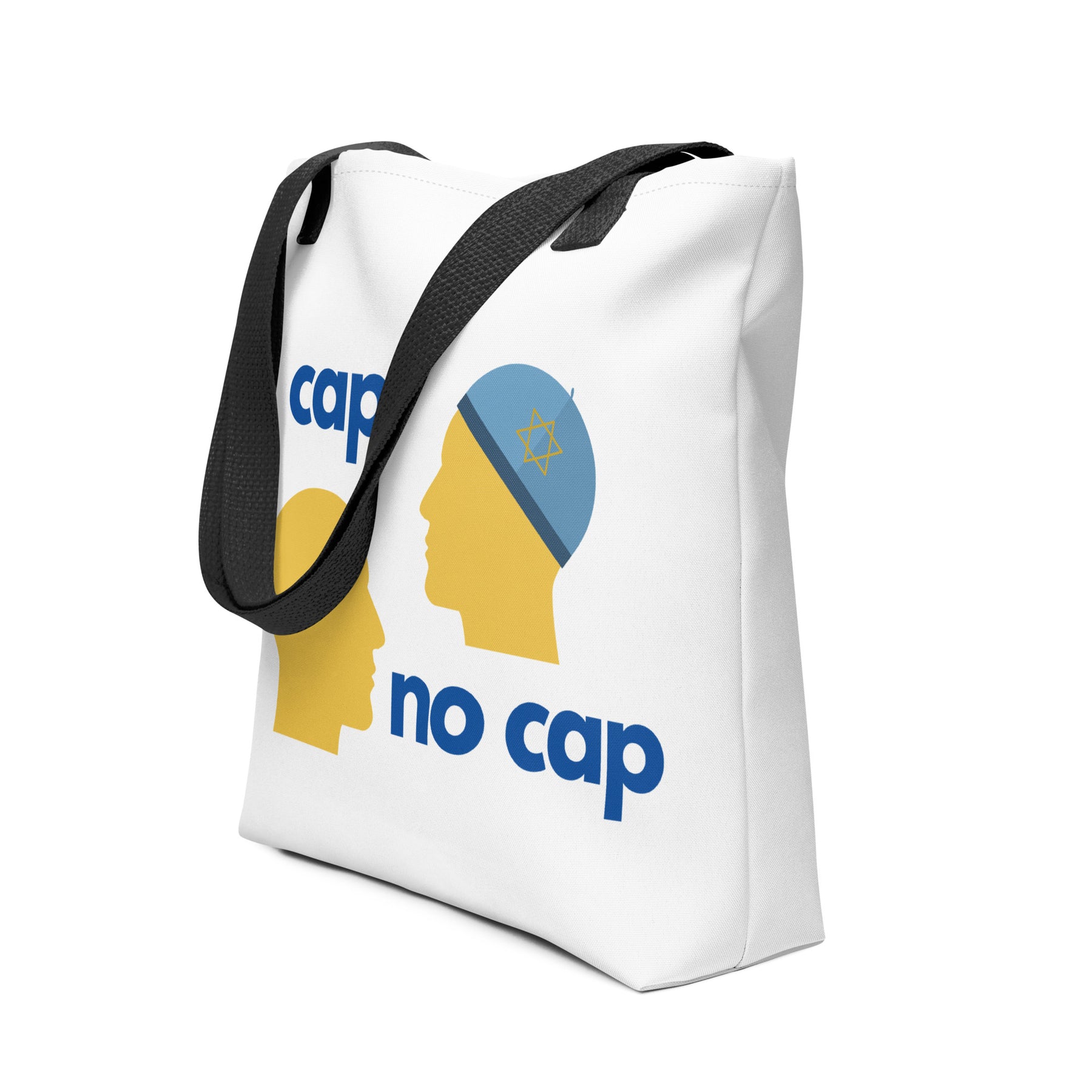 Carry the truth with you. The Cap No Cap Tote Bag turns a phrase everyone knows into a smart Jewish visual joke you can take anywhere. Cap on, cap off, honesty stays the same. Simple, clever, and instantly understood.