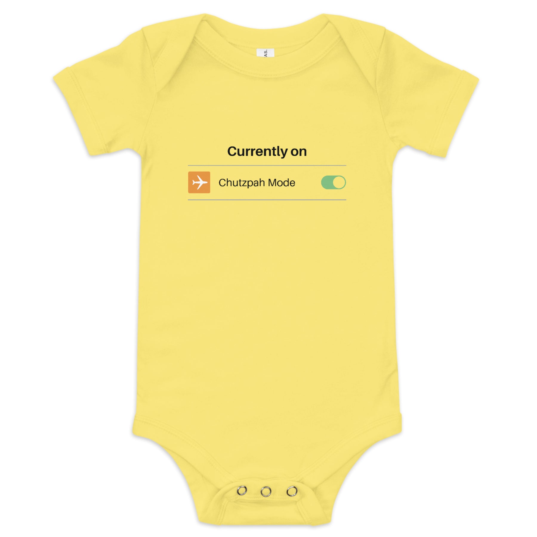 Right on the front is the tiny toggle graphic that says “Currently on: Chutzpah Mode.” It’s adorable, funny, and honestly way too accurate for most babies who already have a personality bigger than they are. The print stays bright, the fabric is gentle on delicate skin, and the one-piece design makes dressing and diaper changes a whole lot easier.