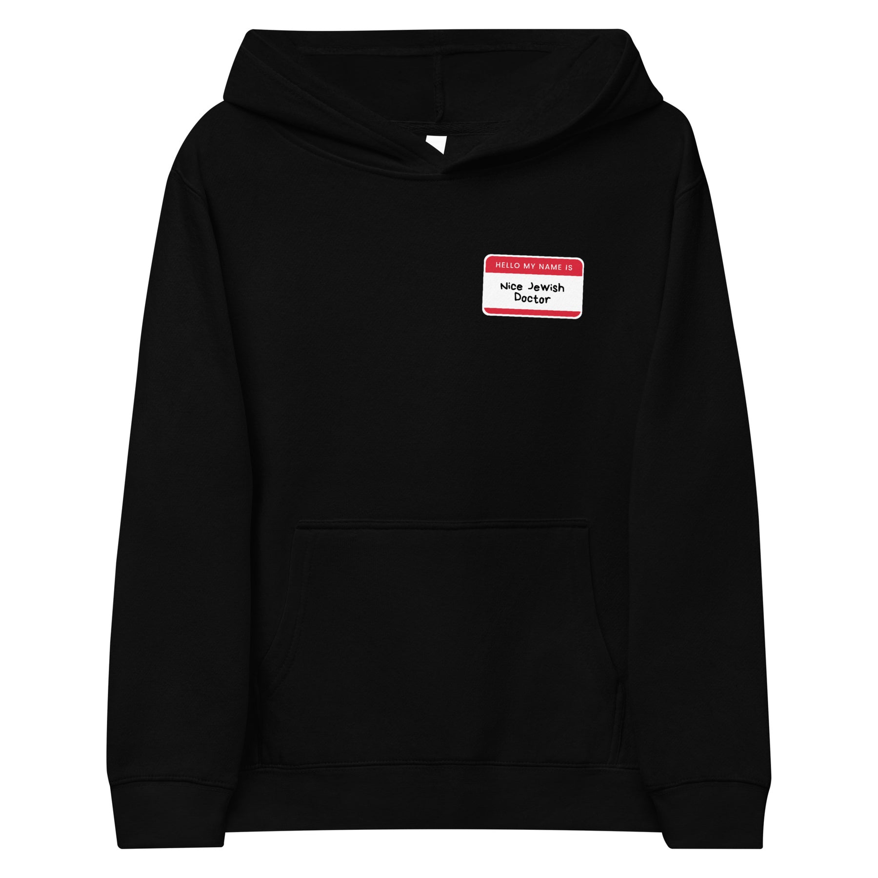 The Nice Jewish Doctor Kids Fleece Hoodie brings classic Jewish humor to kids in the most lovable way. Styled like a familiar name tag, the message says everything generations of parents and grandparents are quietly hoping for. No pressure. Just tradition.