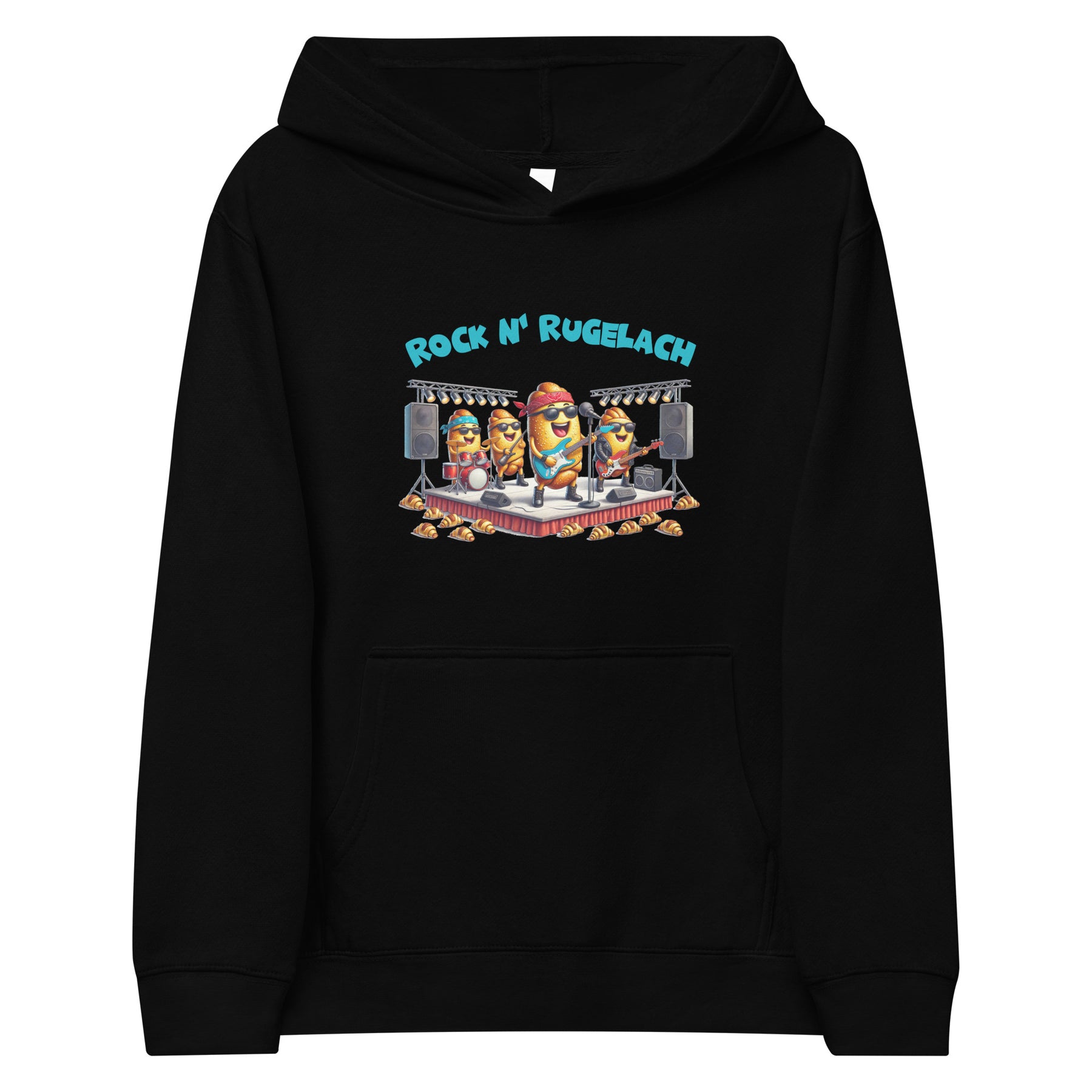 Wrap your child in warmth and fun with our Kids Fleece Hoodie featuring the playful “Rock n’ Rugelach” design 🎸🥐 This cozy hoodie showcases rugelach pastries rocking the stage, blending a love for music and sweet treats. Perfect for school, play, or casual outings, it offers soft comfort and a touch of whimsy while celebrating their favorite pastry!