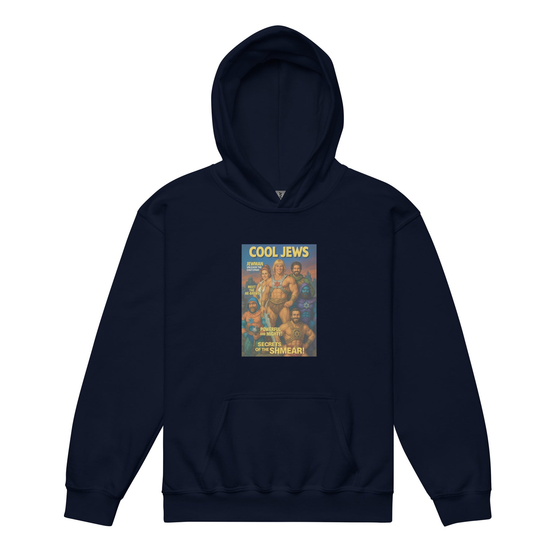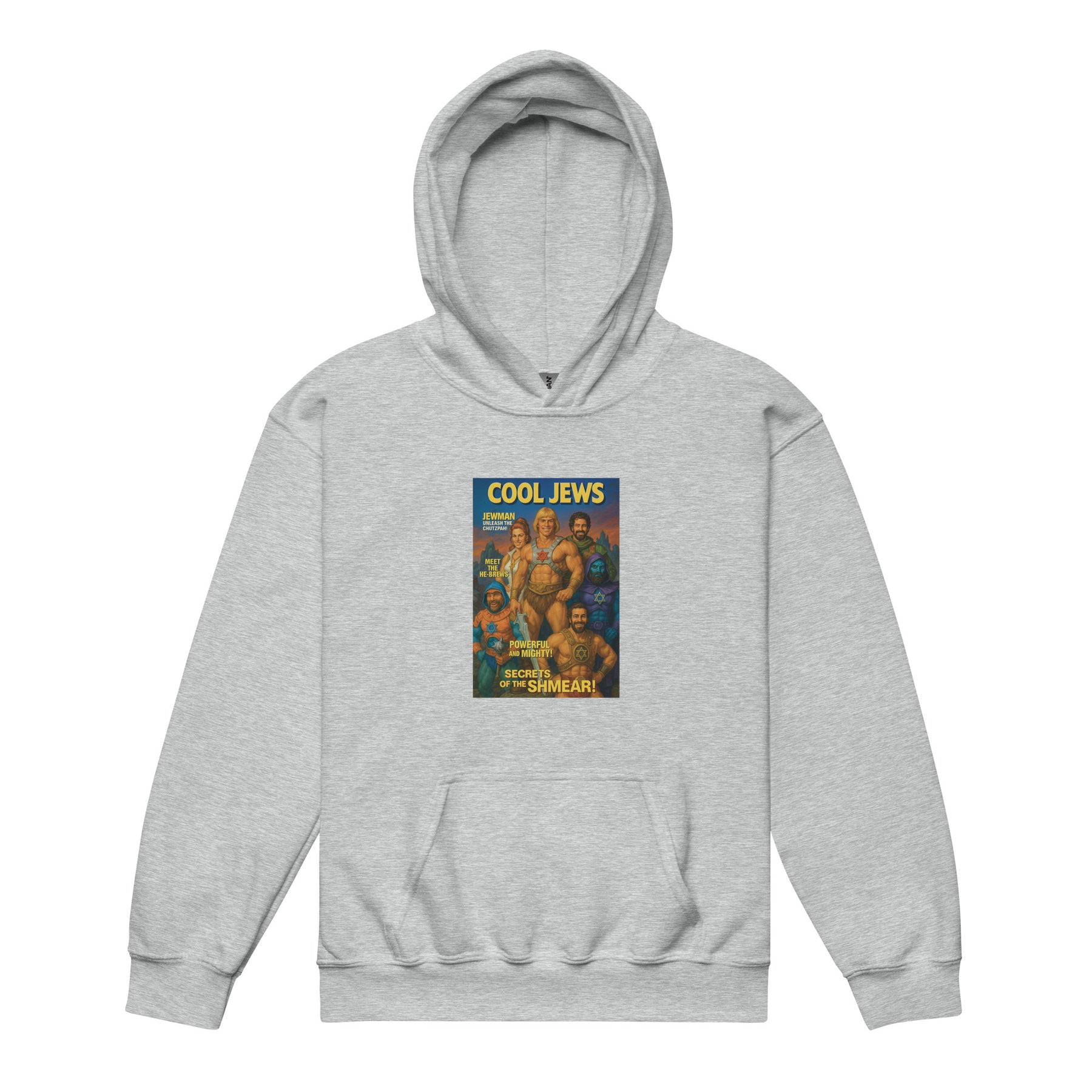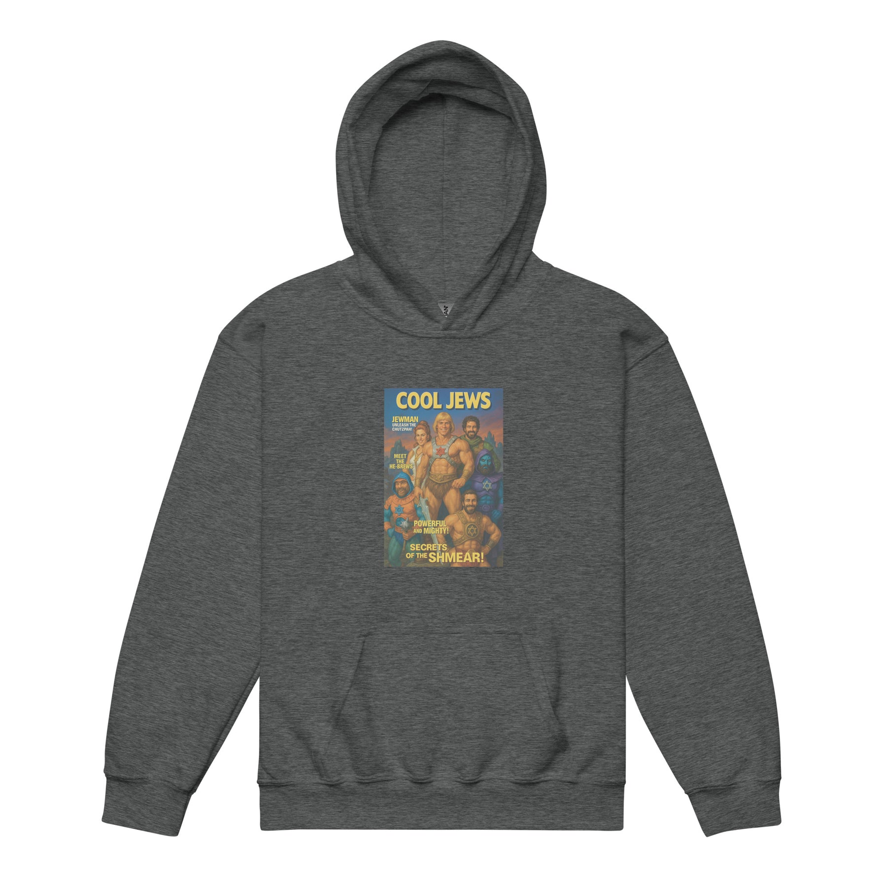 Let your kids unleash the chutzpah in full comfort with the Cool Jews | He-Brews Edition Youth Heavy Blend Hoodie! Inspired by retro comic book heroes, this hilarious Jewish-themed hoodie features Jewman and his heroic crew—the He-Brews—celebrating Jewish pride with humor and muscle.