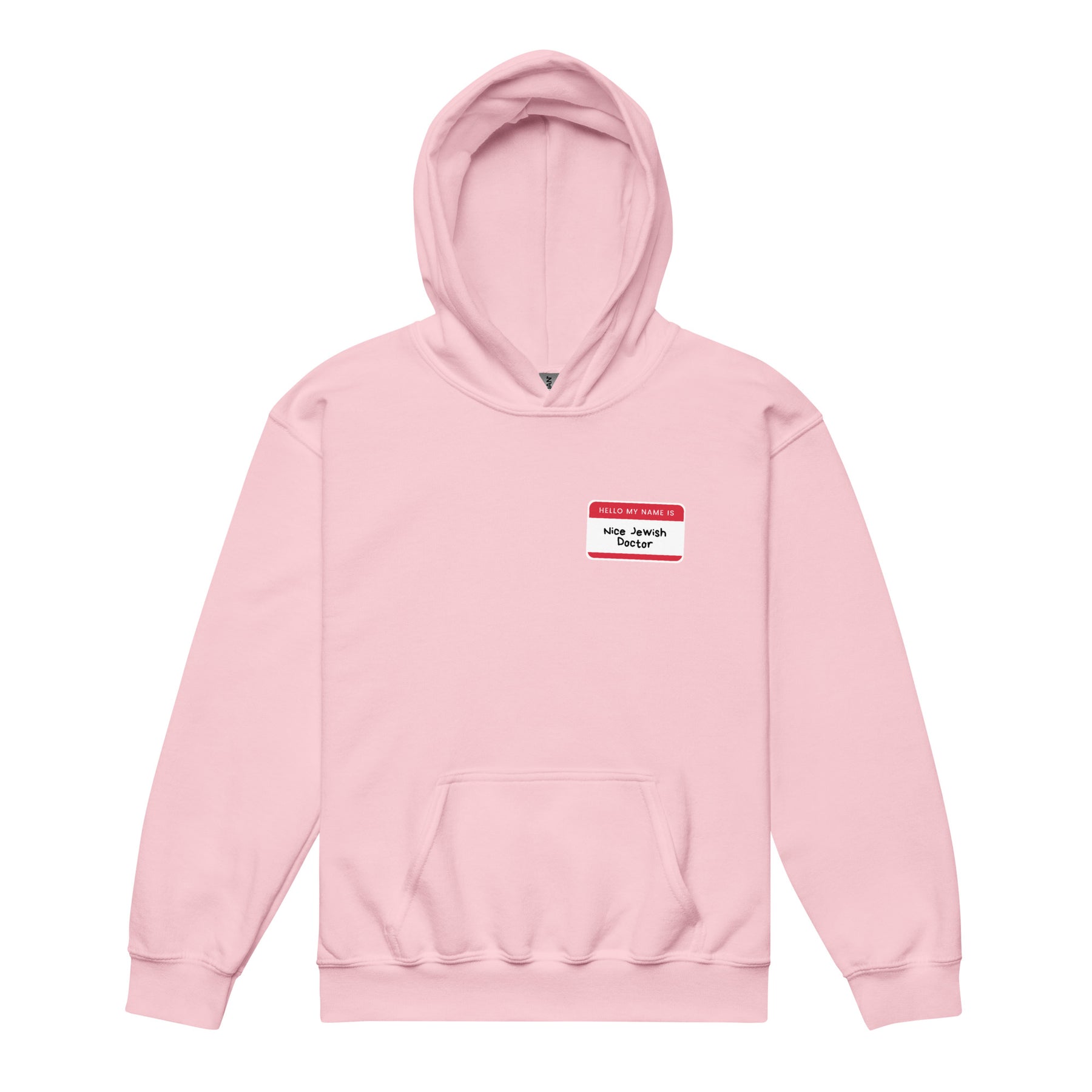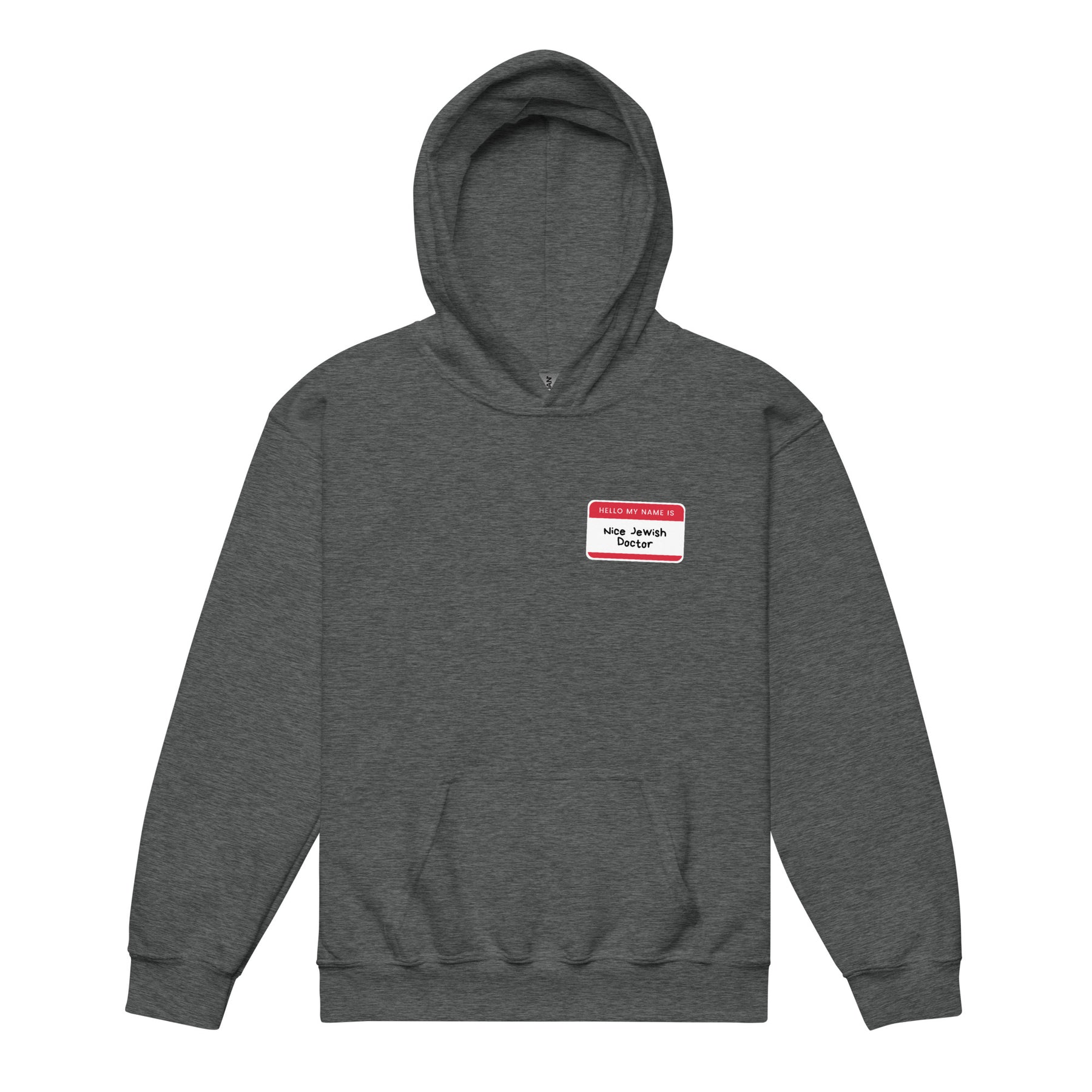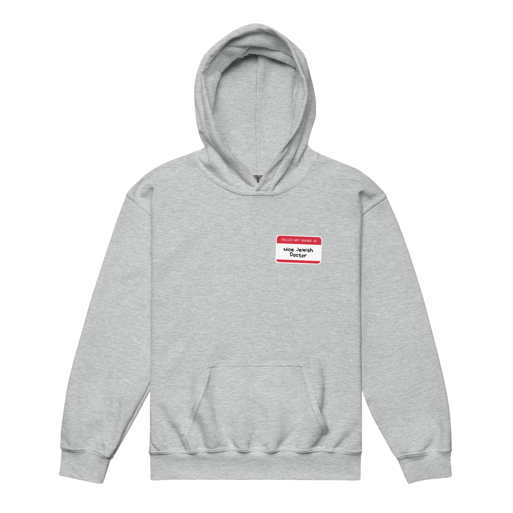 The Nice Jewish Doctor Youth Heavy Blend Hoodie brings classic Jewish humor to kids in the most lovable way possible. Styled like a familiar name tag, the message says exactly what generations of parents are hoping for. No pressure. Just tradition.