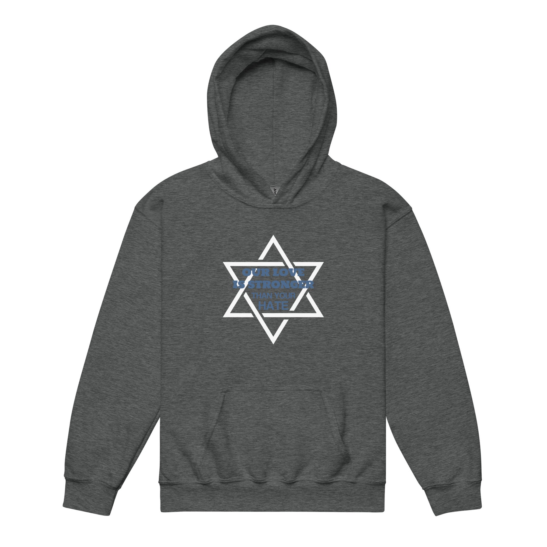 Let your kids wear their values loud and proud. This “Our Love Is Stronger Than Your Hate” youth hoodie is more than just a cozy essential—it’s a bold message of Jewish pride, resilience, and unity.