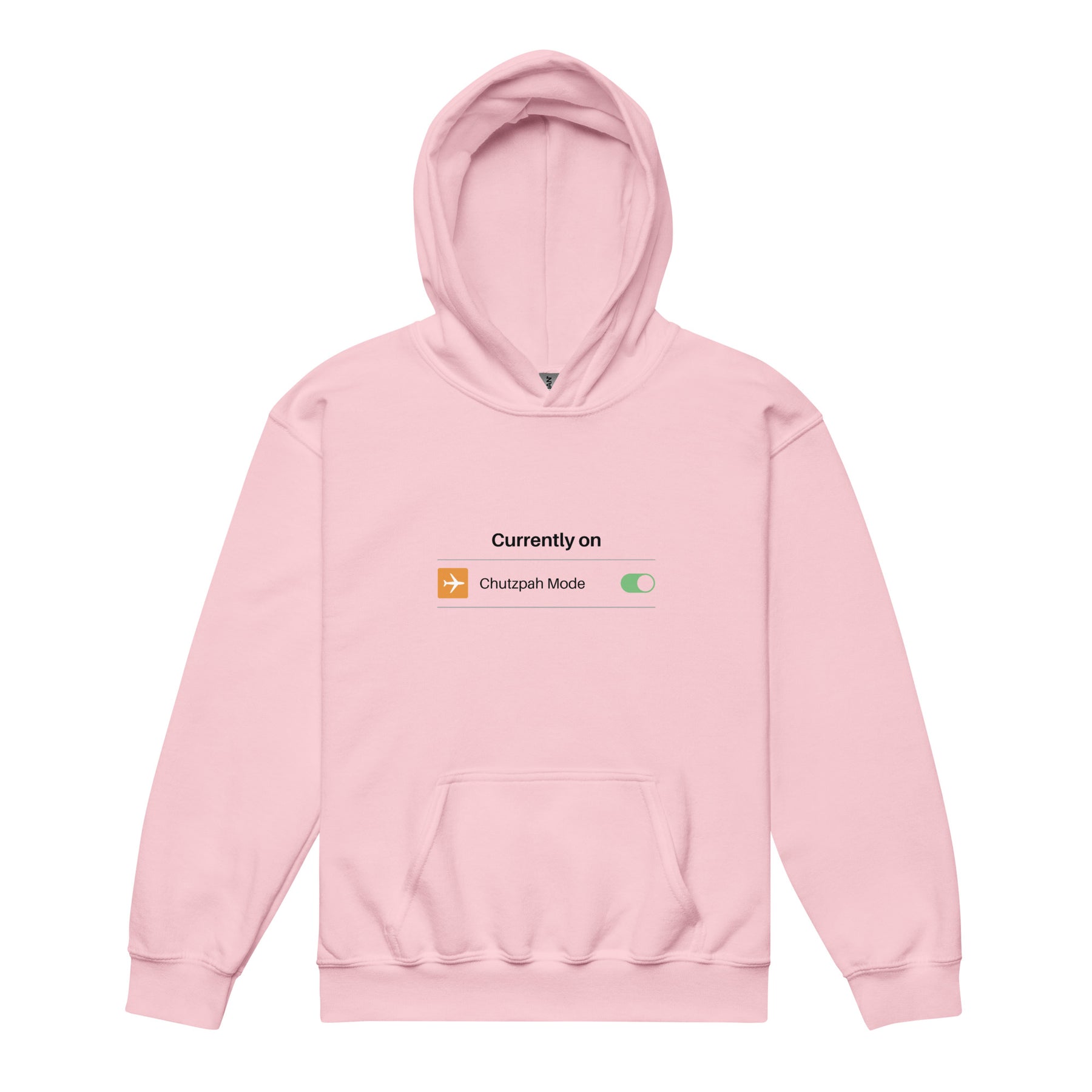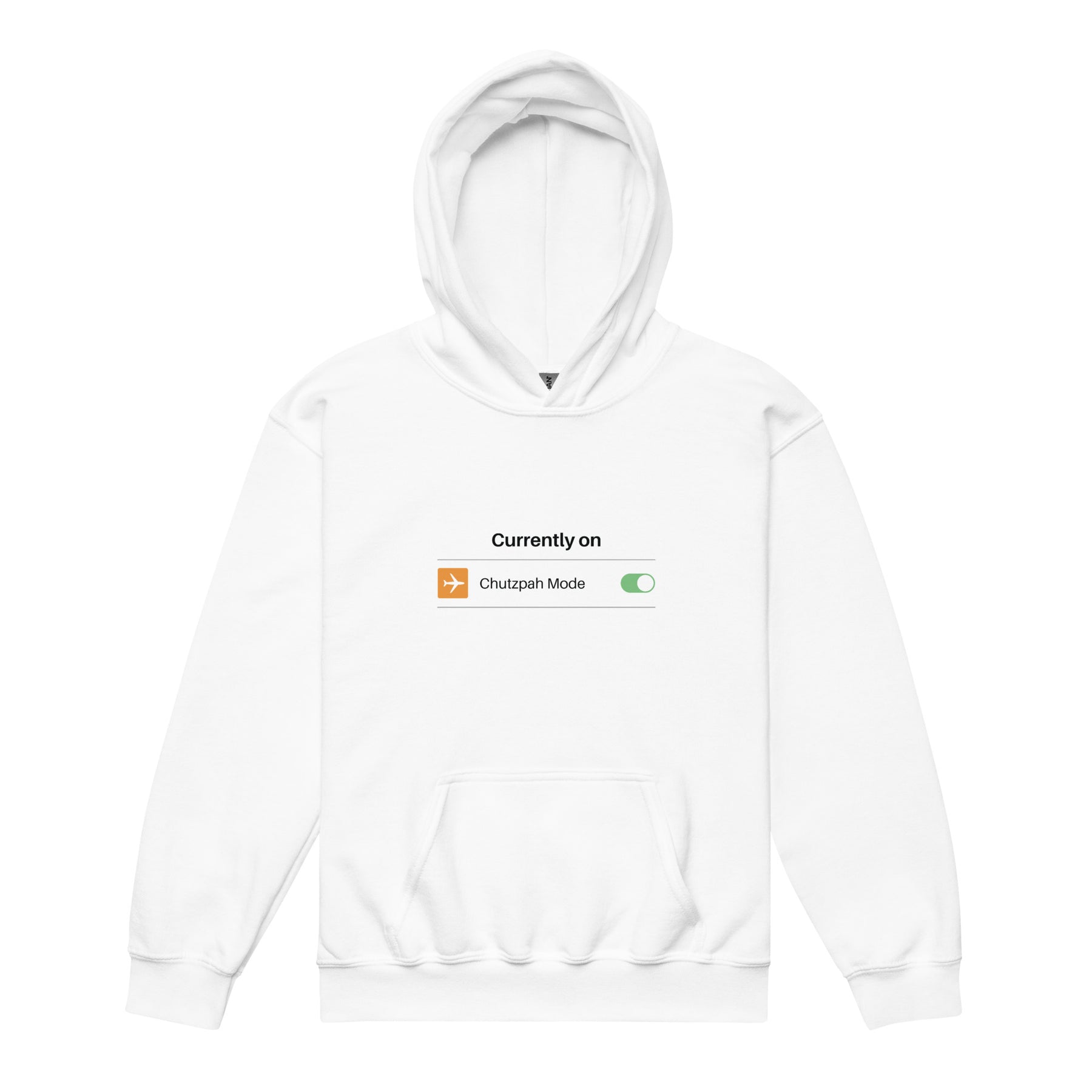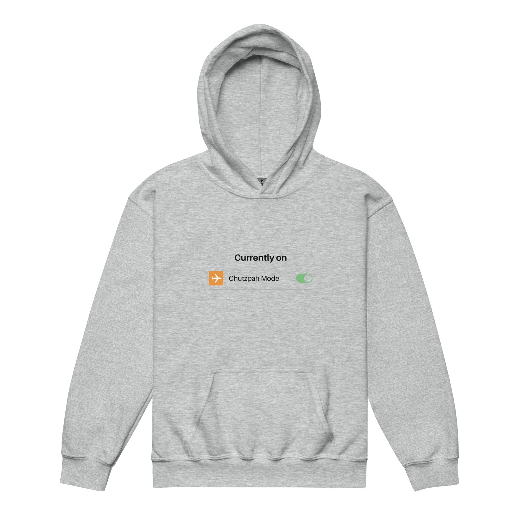 On the front is the cute little toggle graphic that says “Currently on: Chutzpah Mode.” It’s simple, funny, and perfect for kids who already have that bold spark. The print stays bright, the hoodie keeps its shape, and the whole thing feels like a favorite from the first wear.