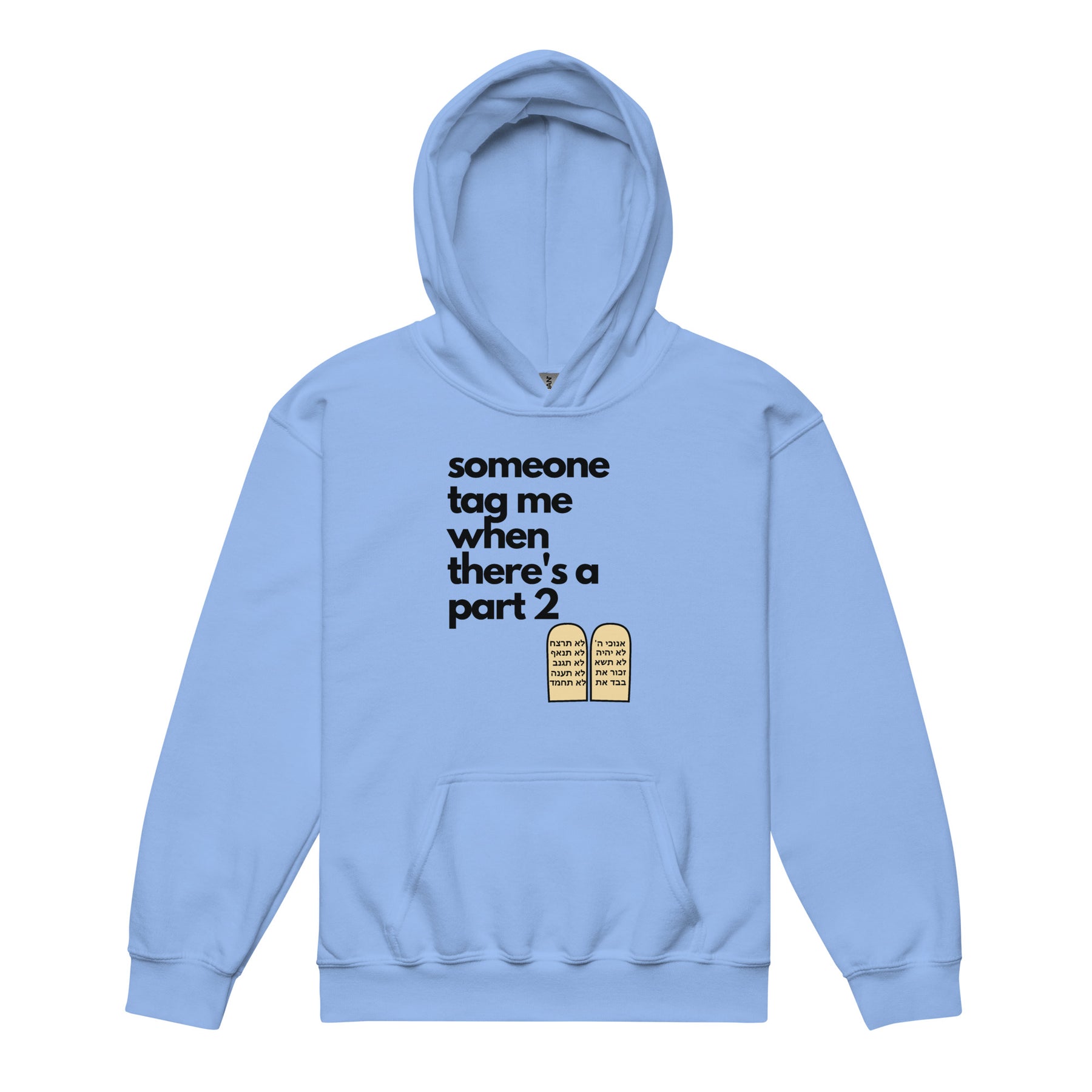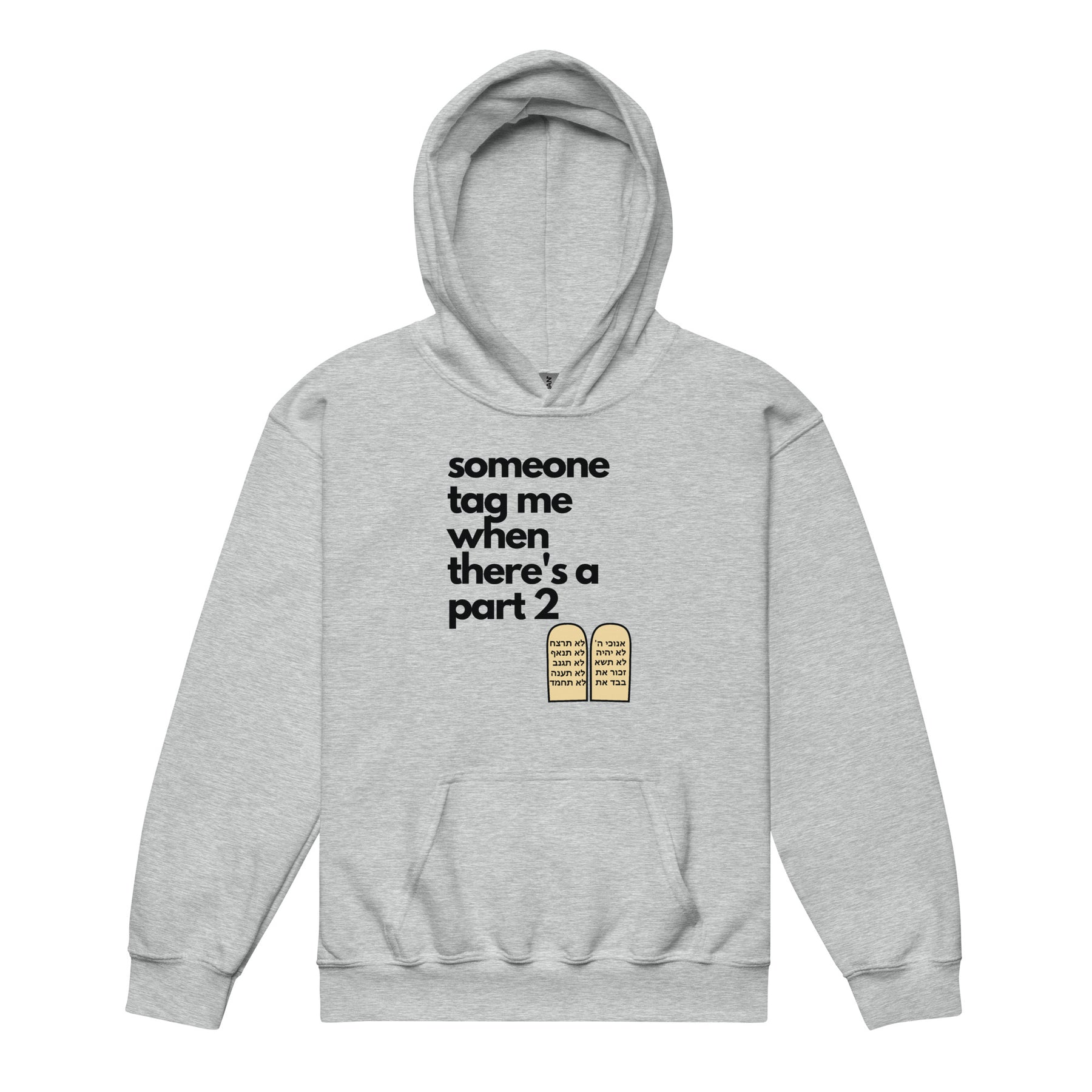 Across the front is the line “someone tag me when there’s a part 2”, paired with the Ten Commandments tablets written in Hebrew. It’s clever, unexpected, and exactly the kind of humor kids love showing off. Teachers giggle, parents smile, and friends instantly ask what it means — which your kid will absolutely love explaining.
