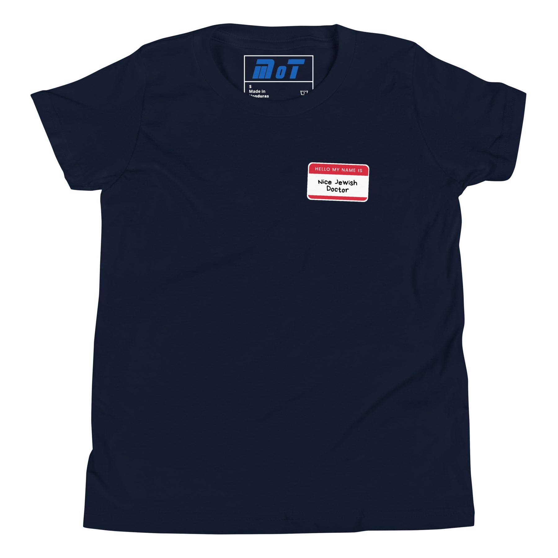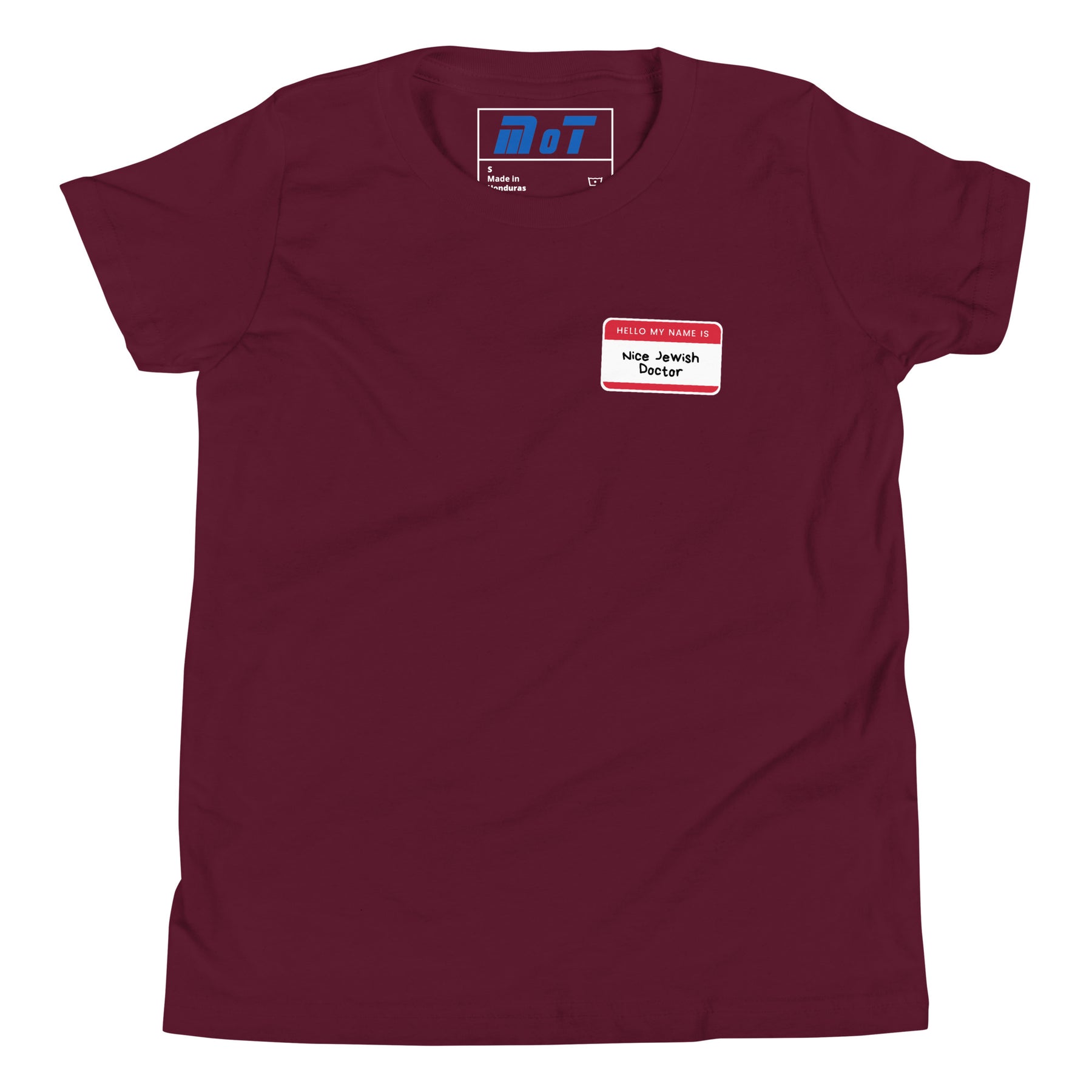 The Nice Jewish Doctor Youth Short Sleeve T-Shirt delivers classic Jewish humor in a fun, lighthearted way for kids. Styled like a familiar name tag, the message is instantly recognizable to parents and family members who know exactly why this is funny.