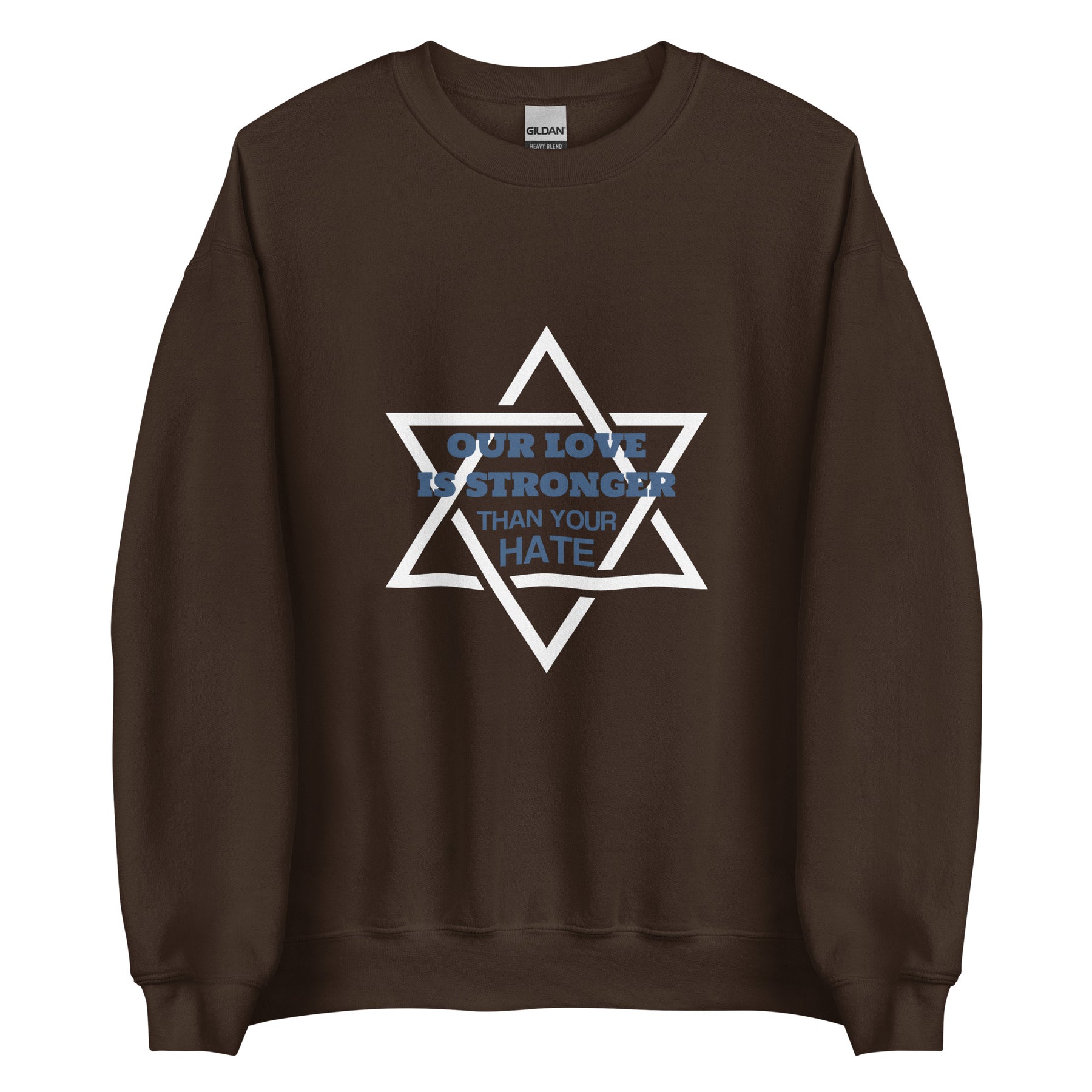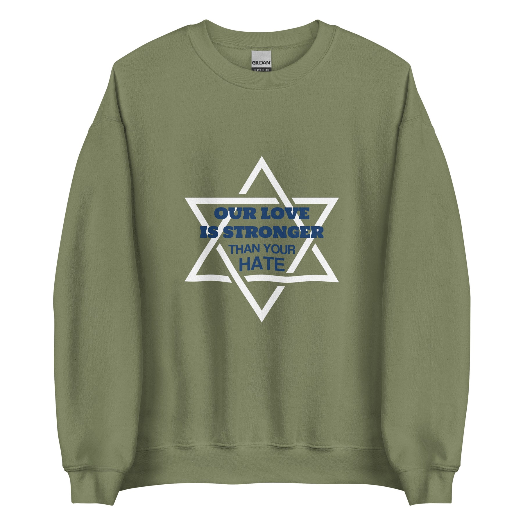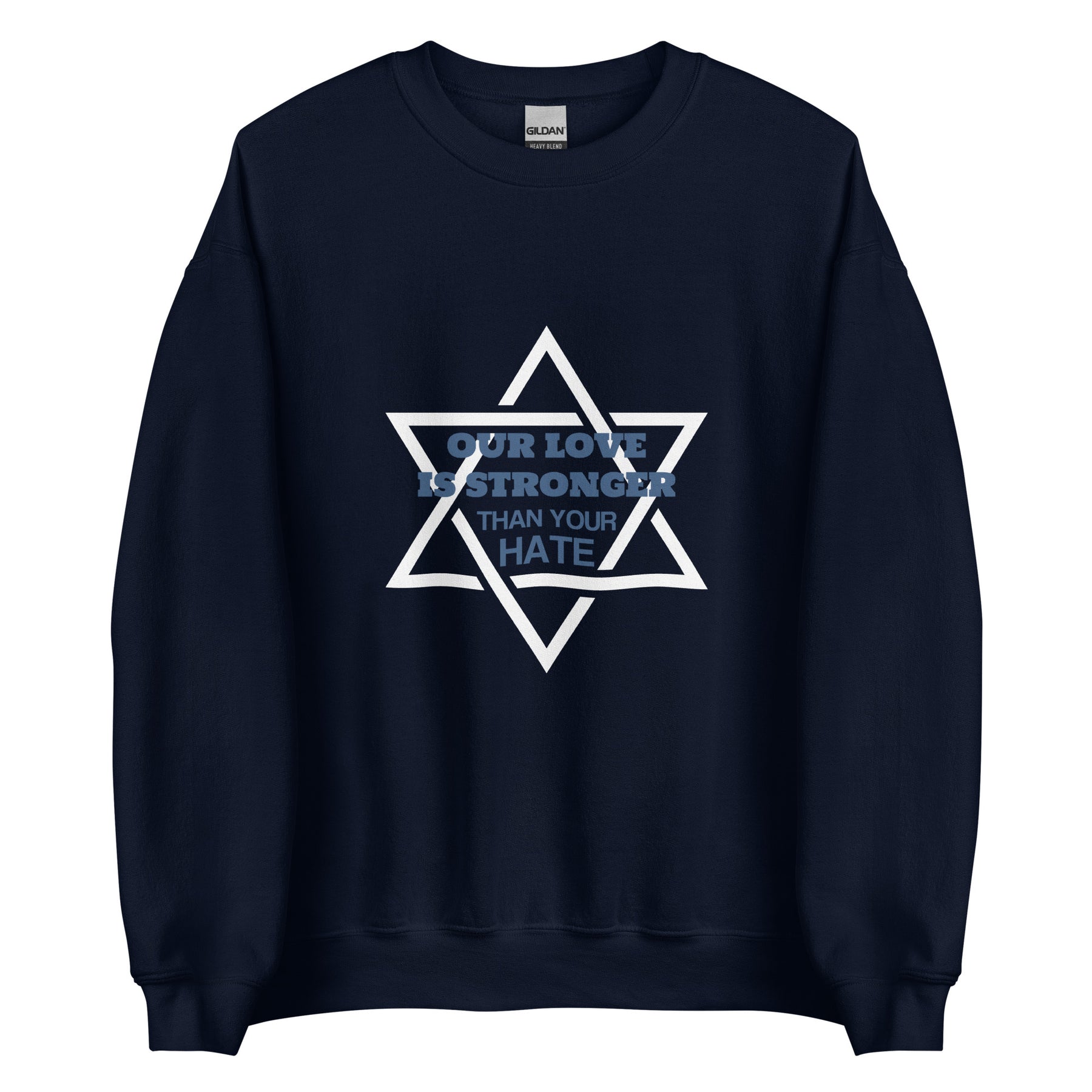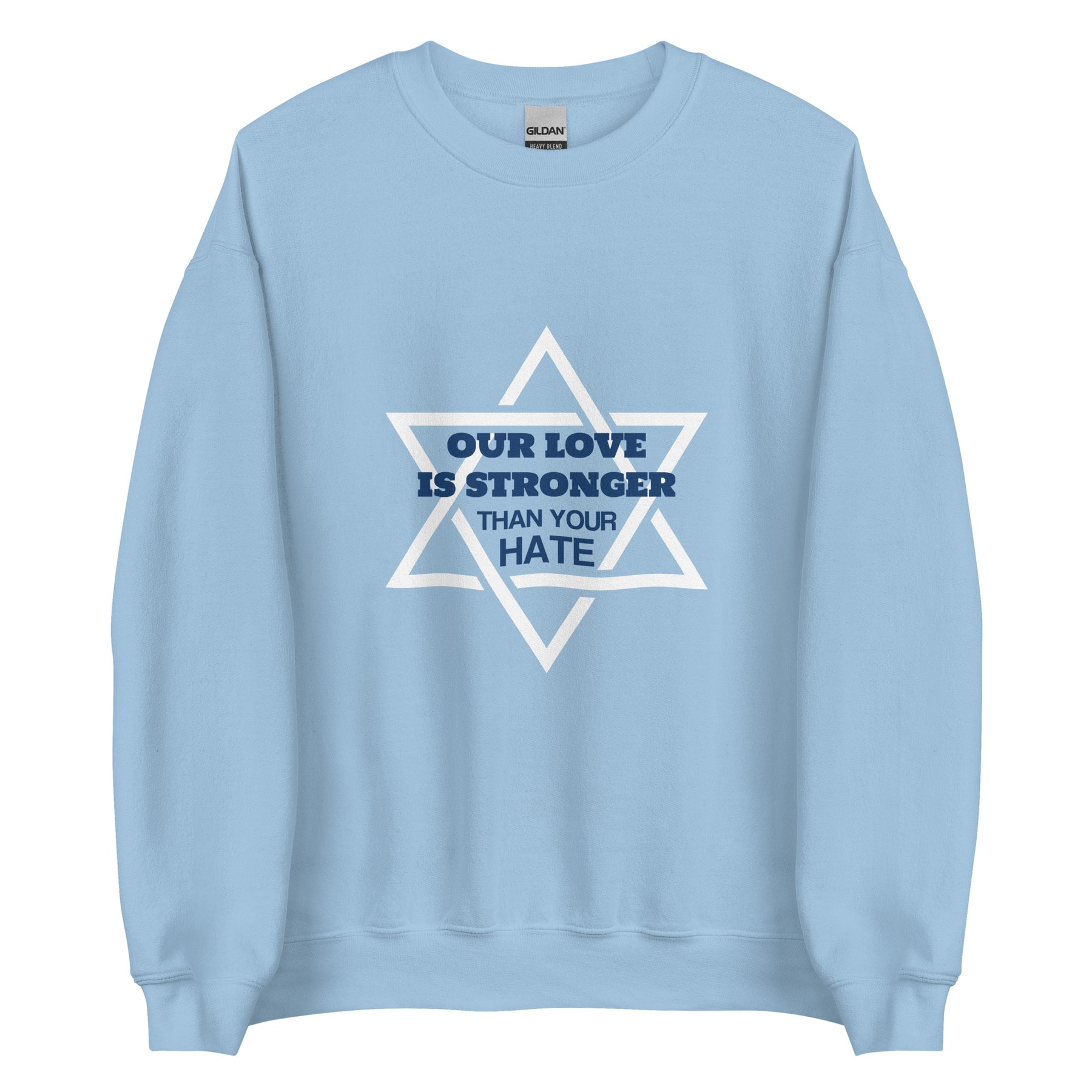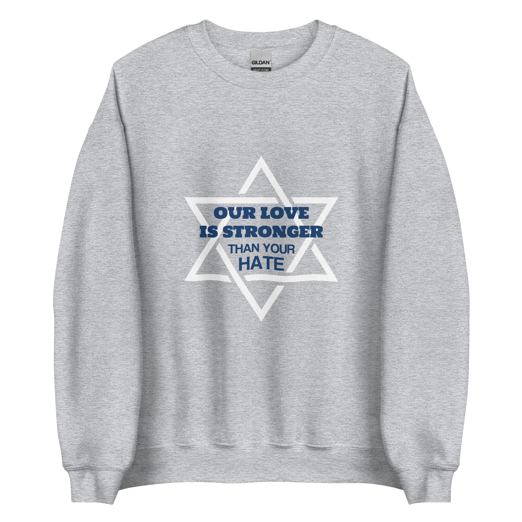 Show the world where you stand — with heart, with strength, and with community. The “Our Love Is Stronger” sweatshirt is a bold expression of Jewish pride, resilience, and love. Whether you’re lighting candles, walking in solidarity, or just keeping warm, this classic sweatshirt blends comfort and conviction.