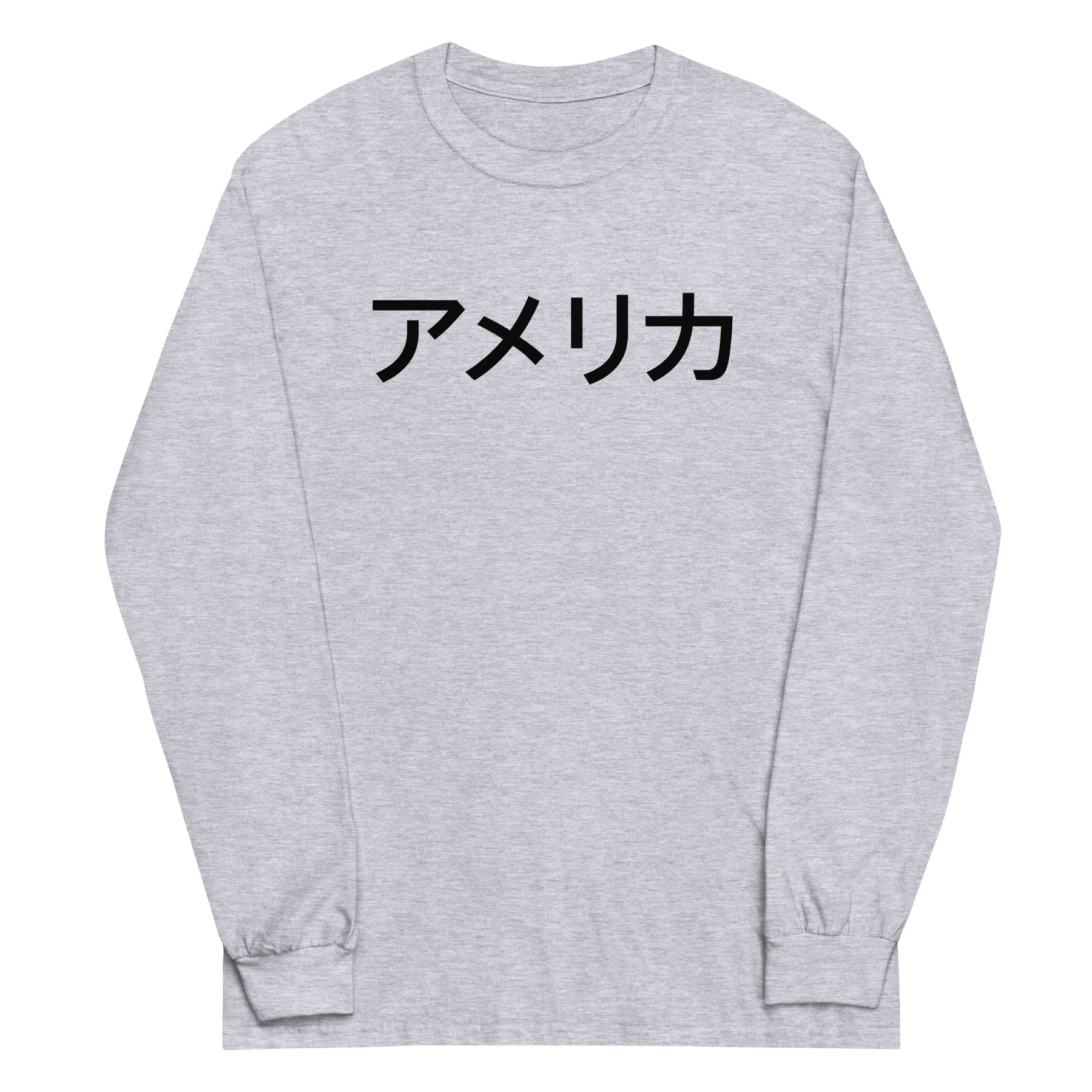 The アメリカ (America) Men’s Long Sleeve Shirt pairs bold Japanese katakana typography with a classic long-sleeve silhouette made for everyday wear. The design is minimal, confident, and modern, turning a single word into a graphic that feels global and intentional.