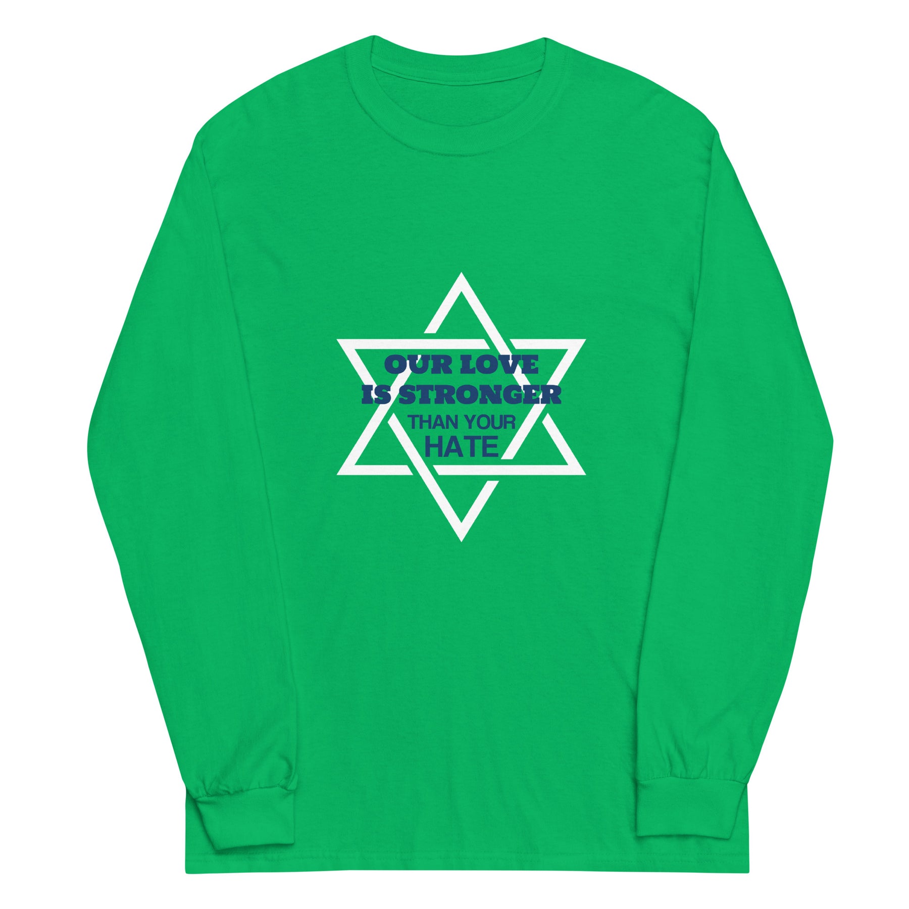 Wear your message with confidence. This Men’s Long Sleeve Shirt features the powerful phrase “Our Love Is Stronger Than Your Hate” — a bold response to antisemitism and hate of all forms. Designed for comfort and resilience, it’s made from soft yet durable cotton that feels as good as it looks.