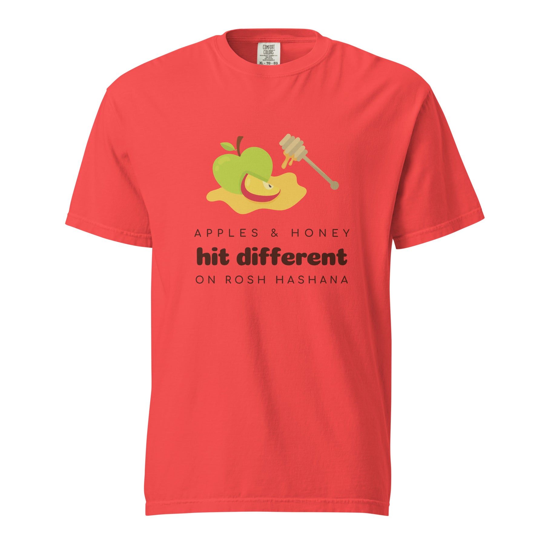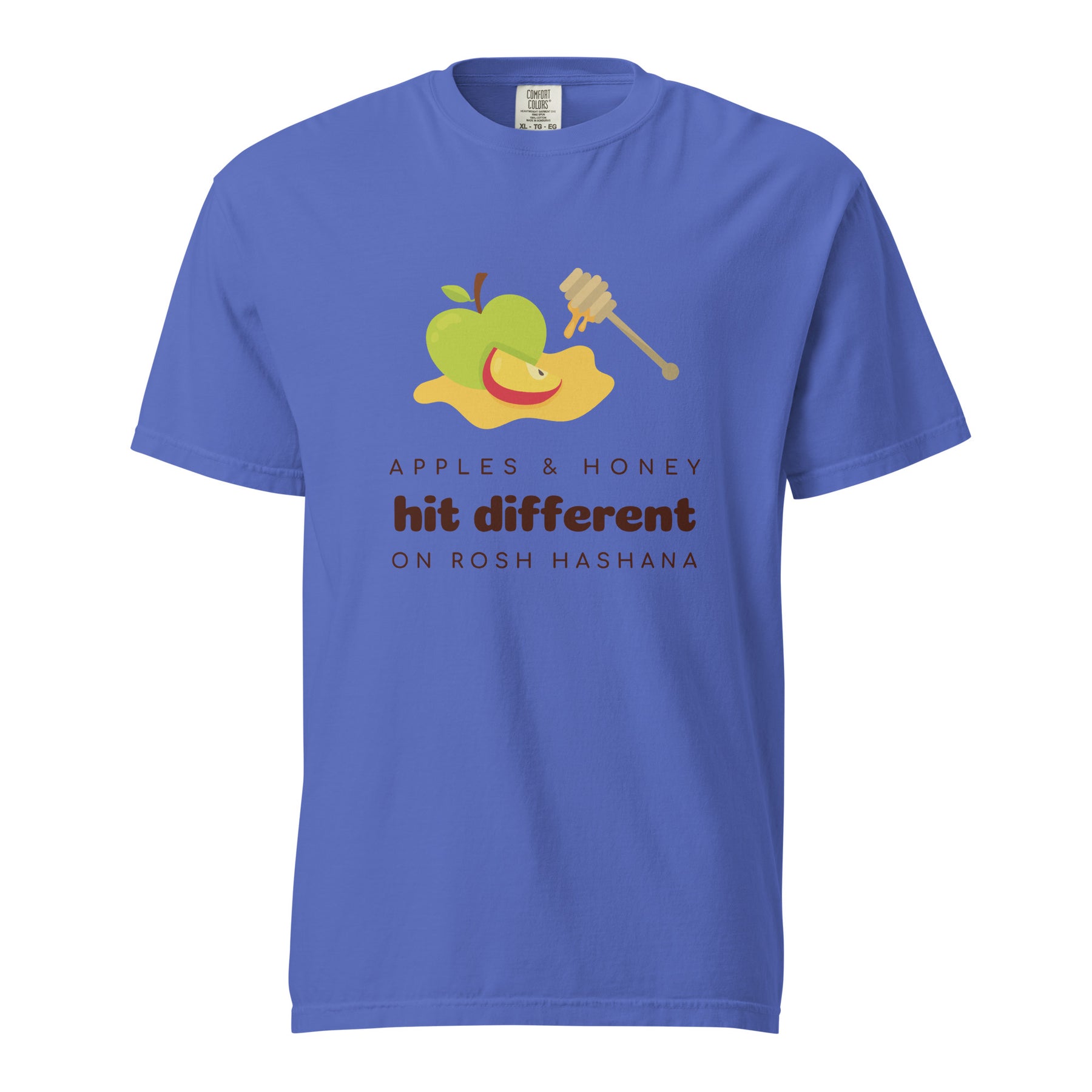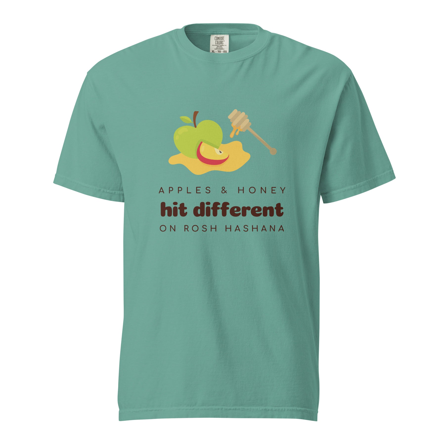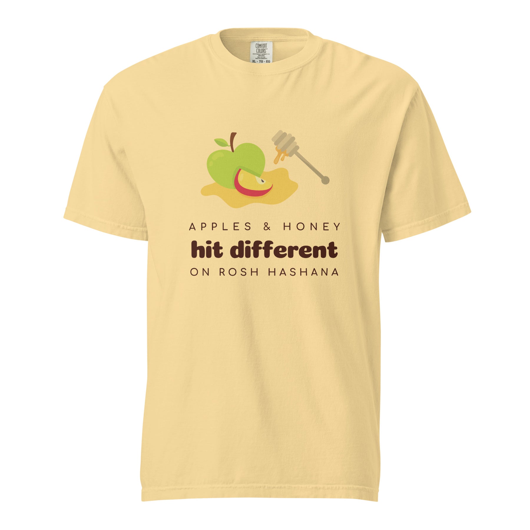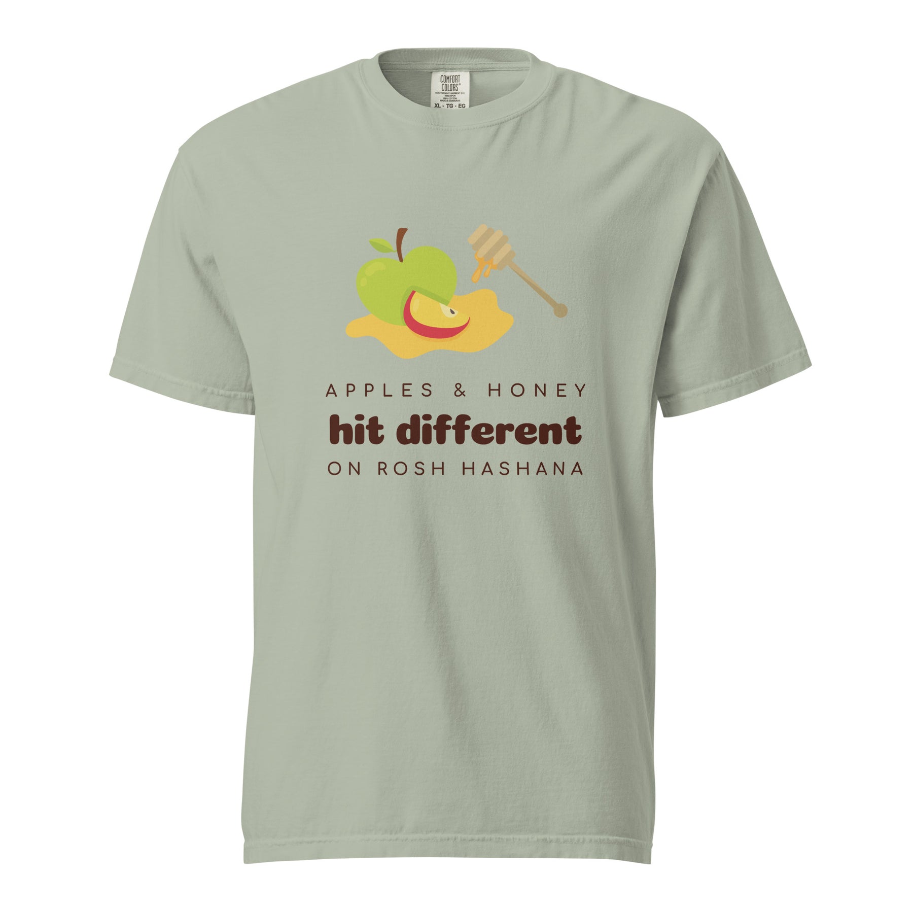 Celebrate Rosh Hashanah with bold comfort and Jewish pride. This premium garment-dyed heavyweight t-shirt features the playful phrase “Apples & Honey Hit Different on Rosh Hashanah,” blending tradition and humor in a standout design.