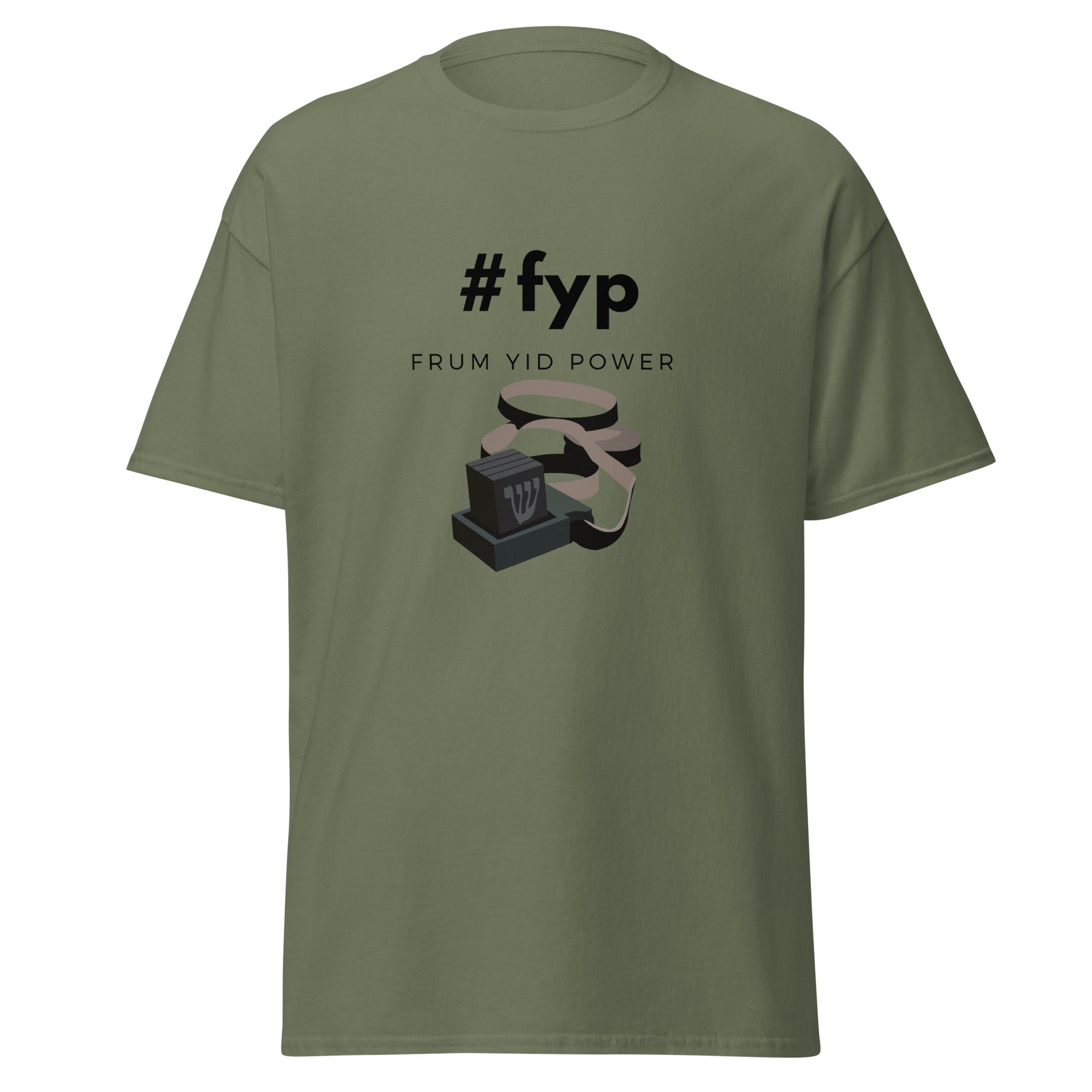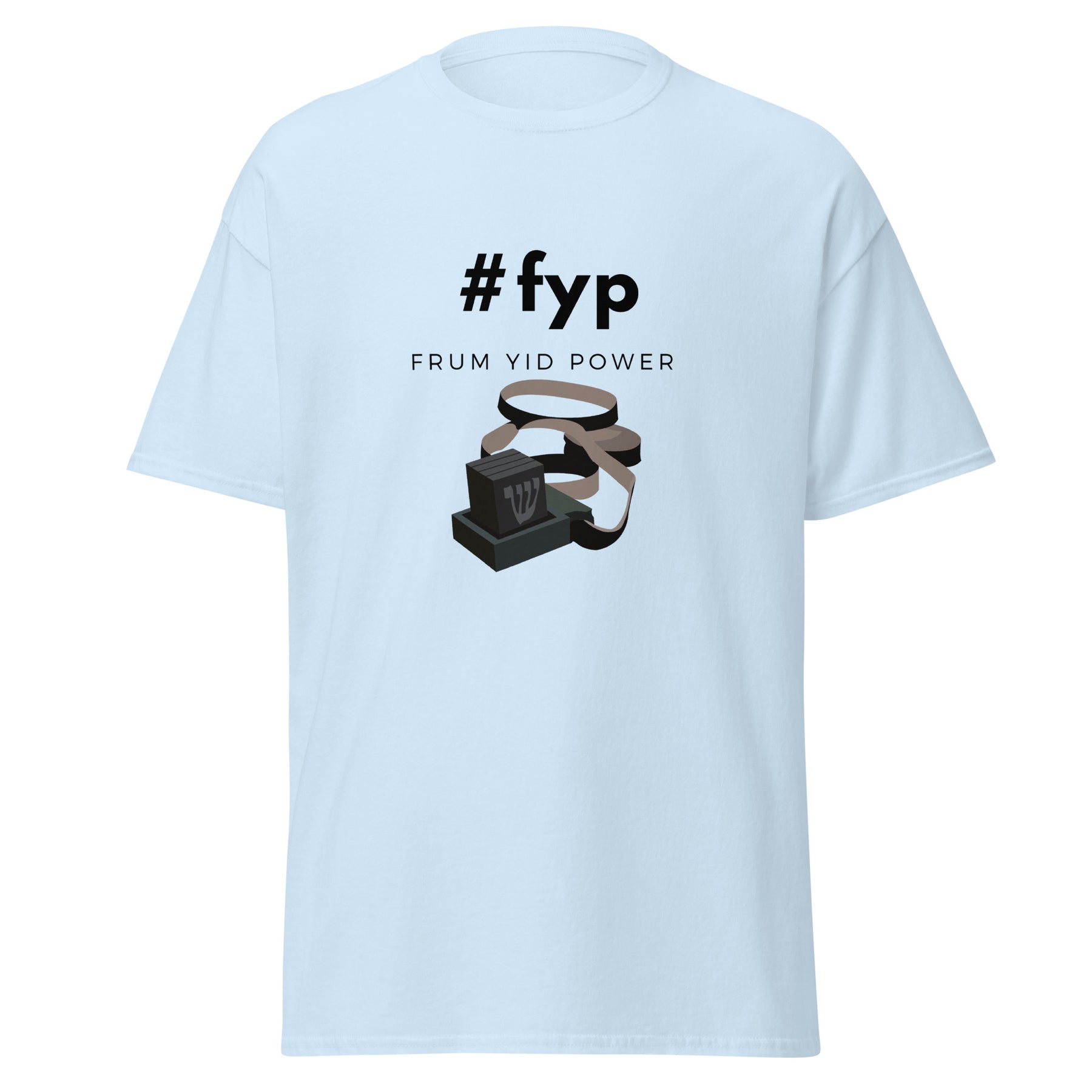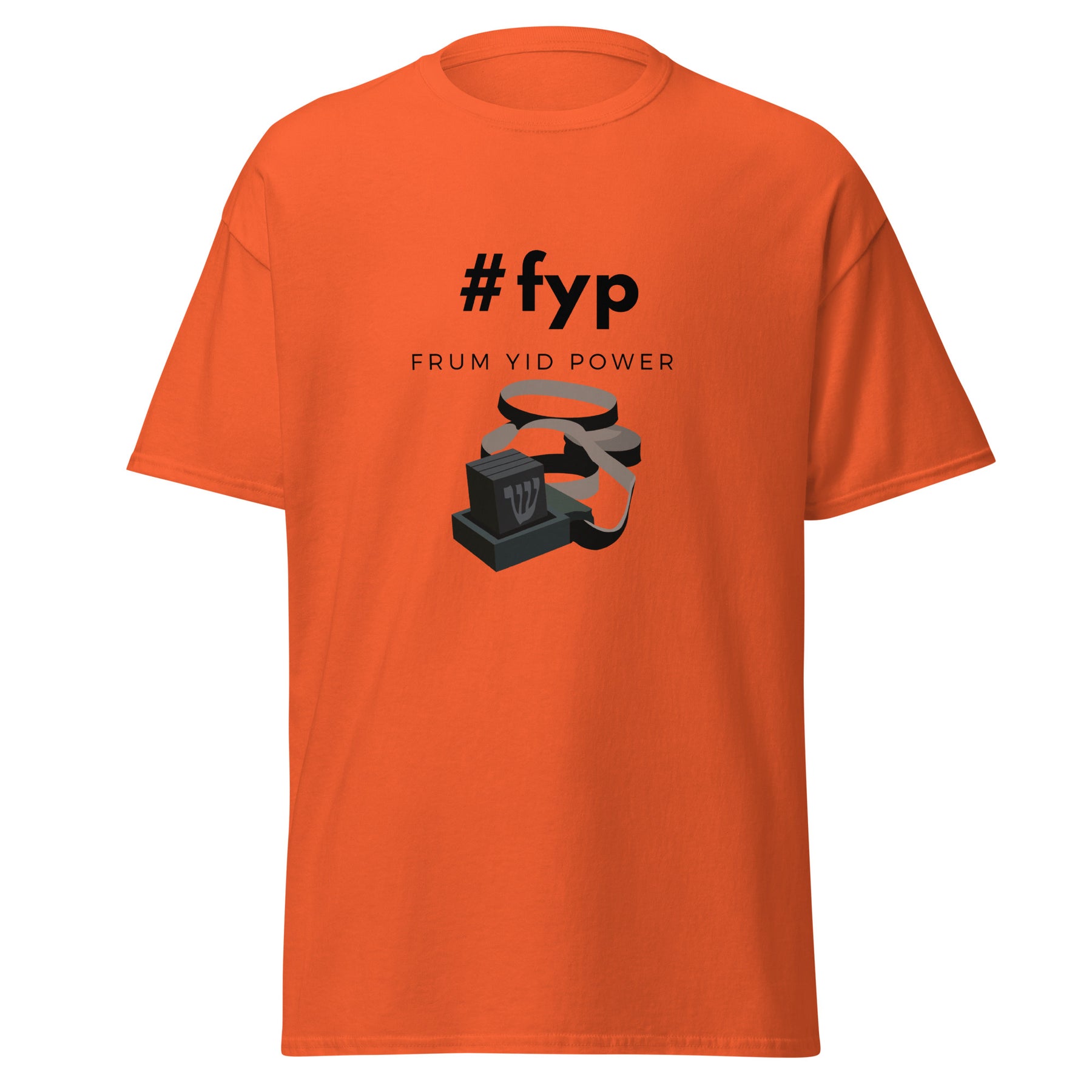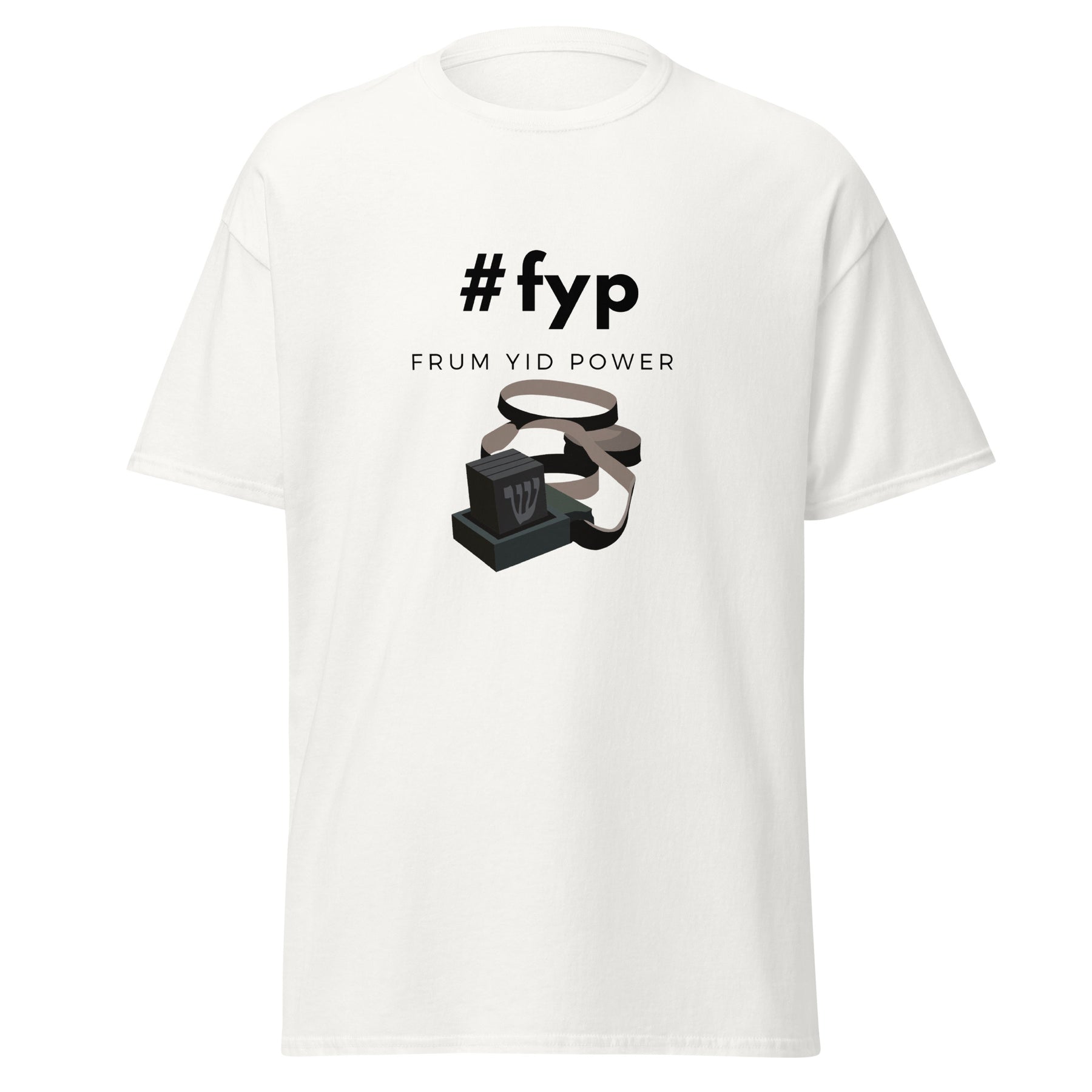The tefillin graphic paired with #fyp – Frum Yid Power reclaims the language of modern culture and grounds it in Torah, tradition, and lived Jewish commitment. It’s about strength through mitzvot, discipline, and faith. A shirt for those who know who they are and don’t need approval.