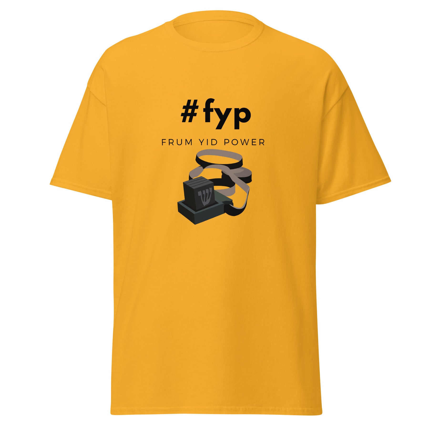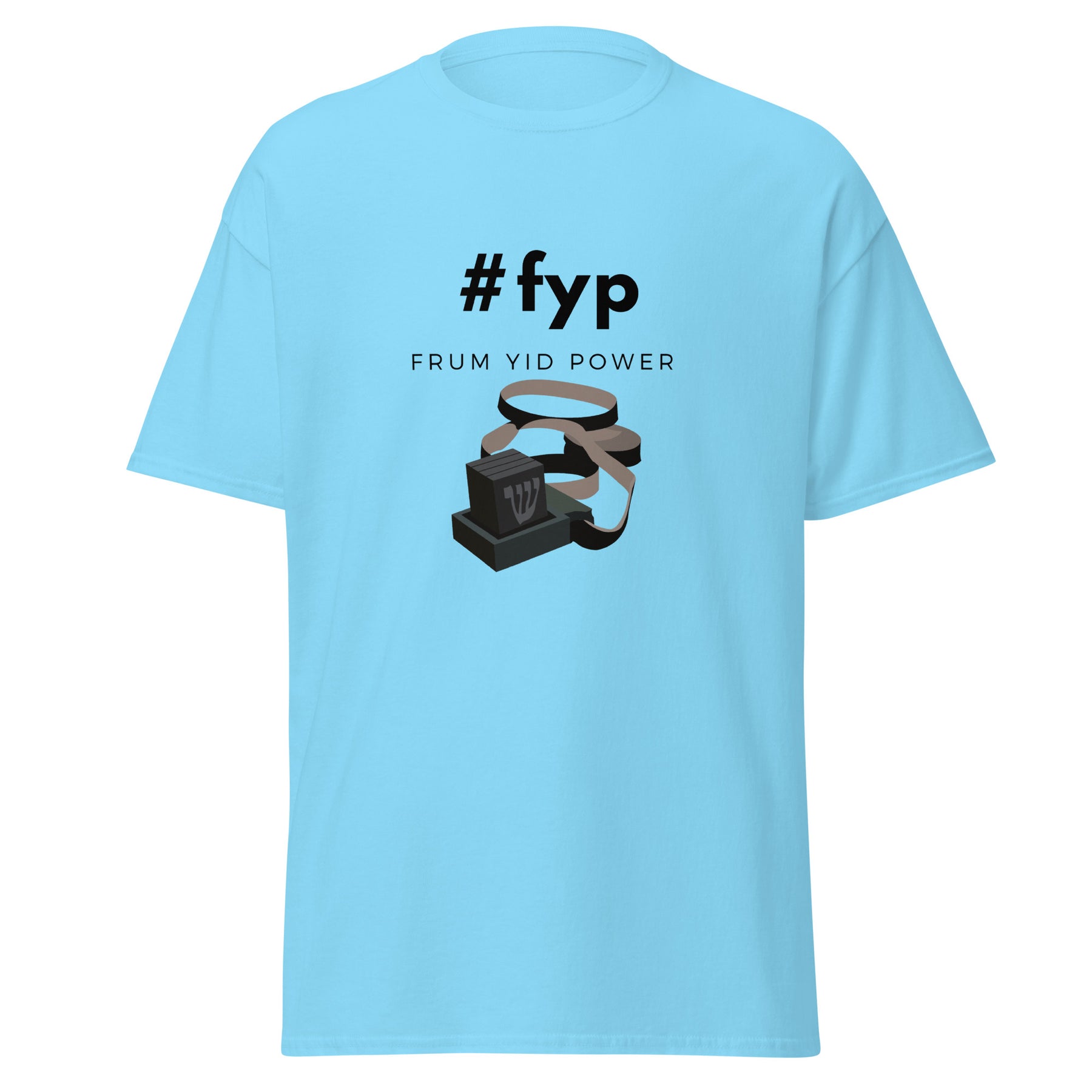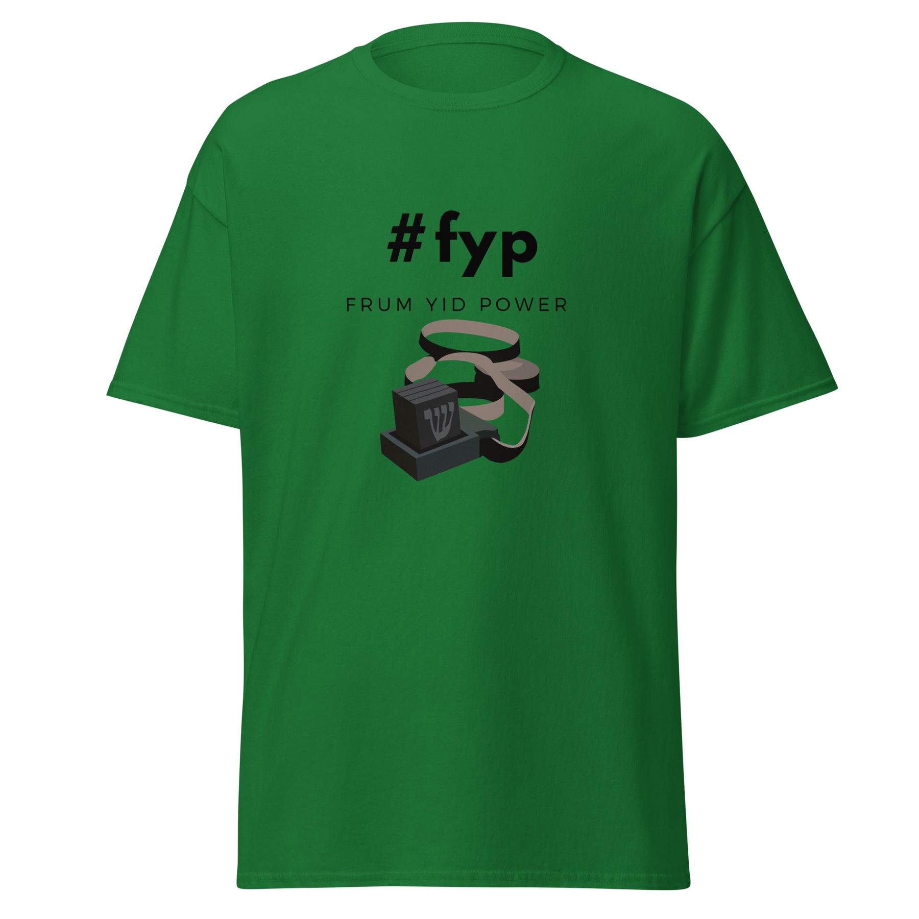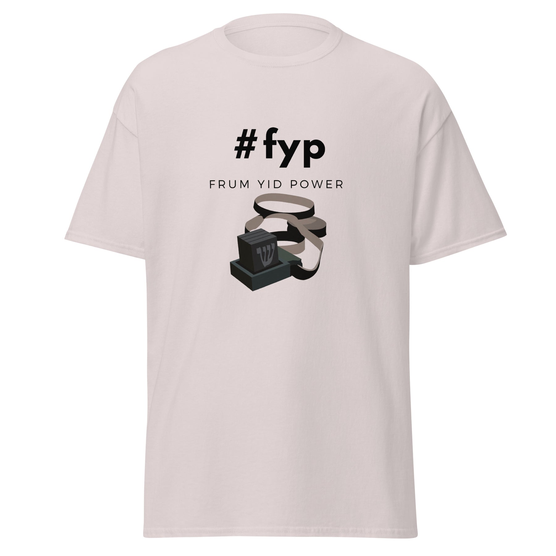 The tefillin graphic paired with #fyp – Frum Yid Power reclaims the language of modern culture and grounds it in Torah, tradition, and lived Jewish commitment. It’s about strength through mitzvot, discipline, and faith. A shirt for those who know who they are and don’t need approval.