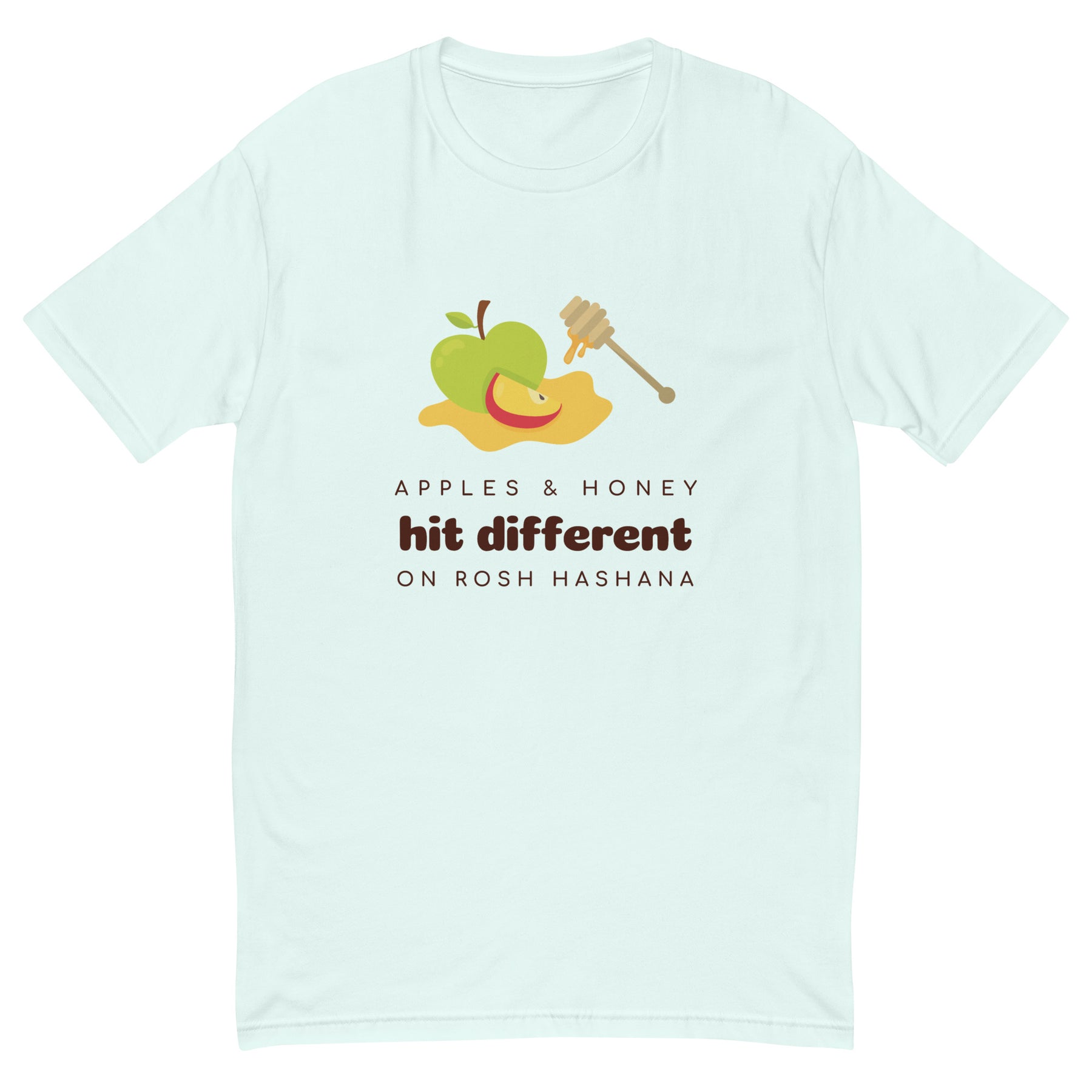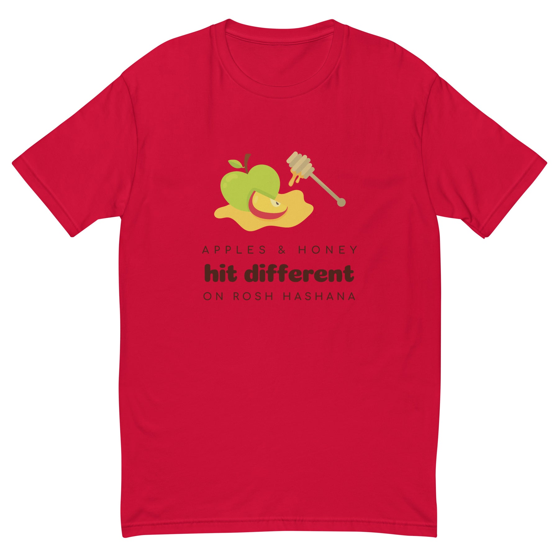 Celebrate Rosh Hashanah in style with this fitted tee that blends Jewish tradition and modern humor. Featuring the fun phrase “Apples & Honey Hit Different on Rosh Hashanah”, this shirt is made for those who like their holidays with a side of sweet sarcasm.