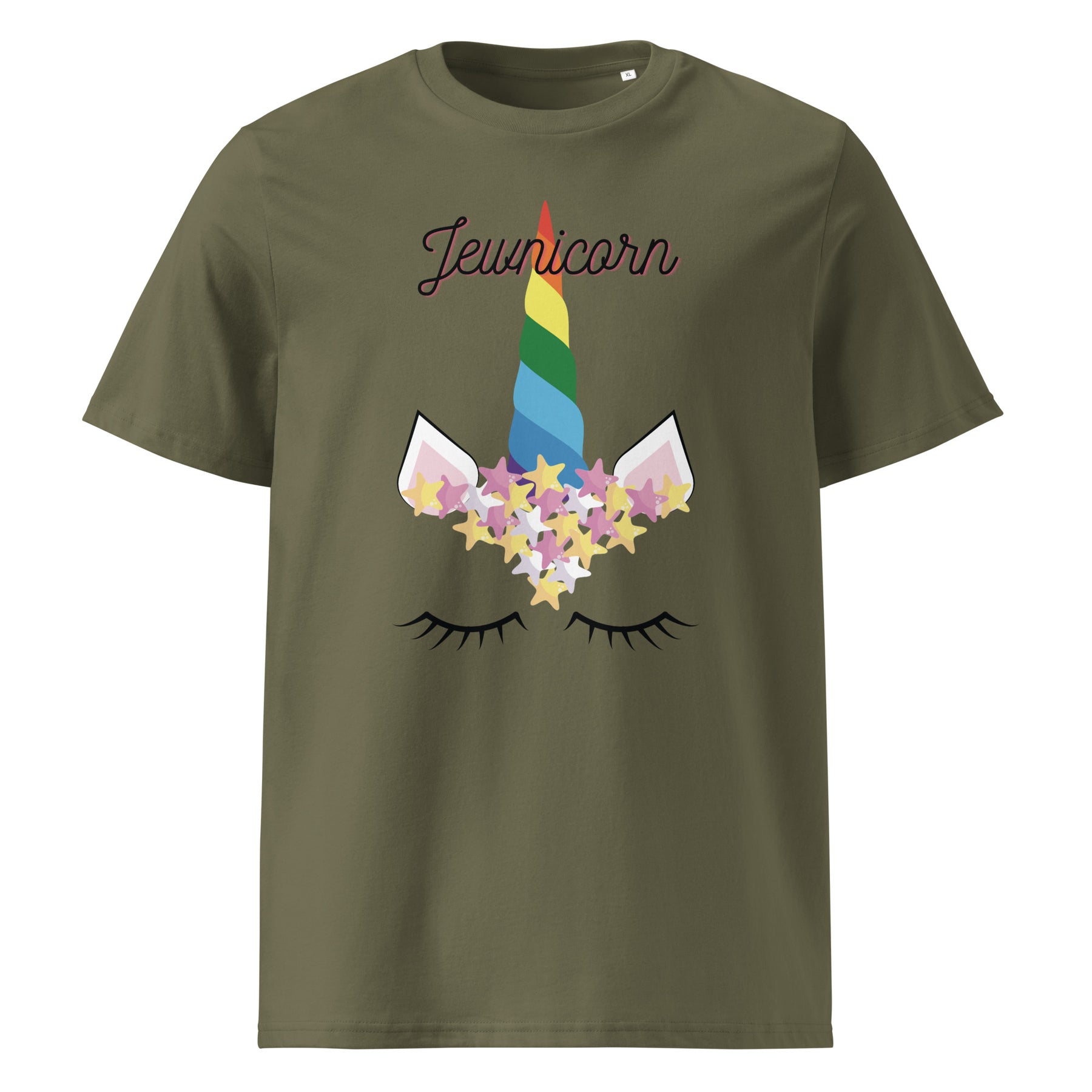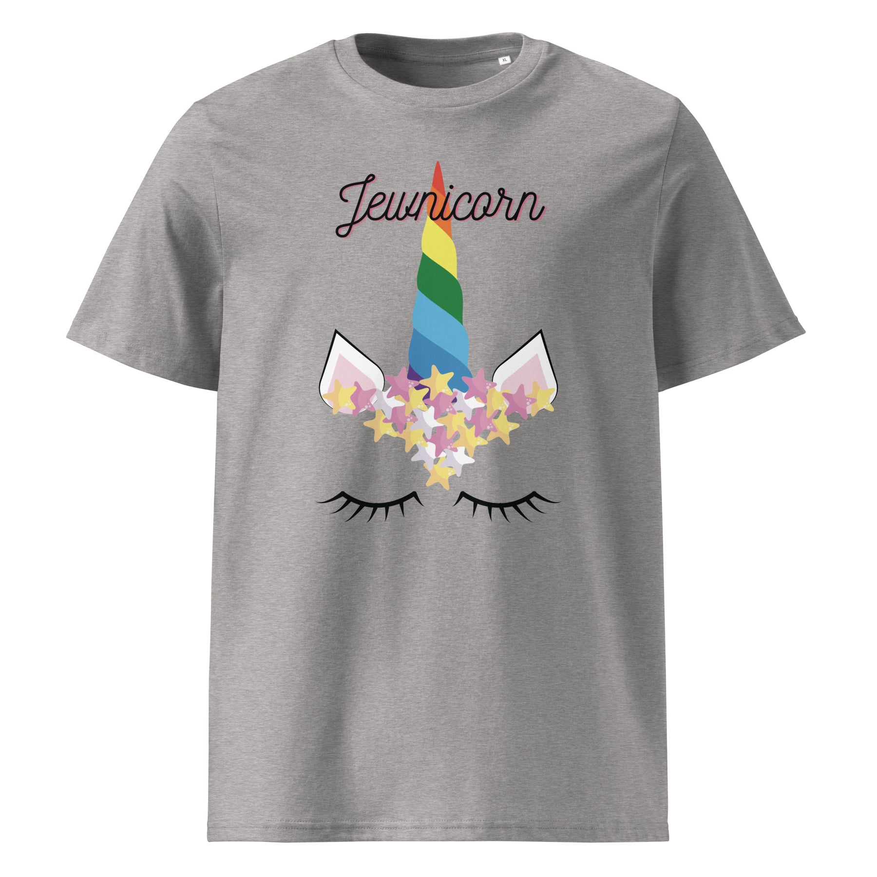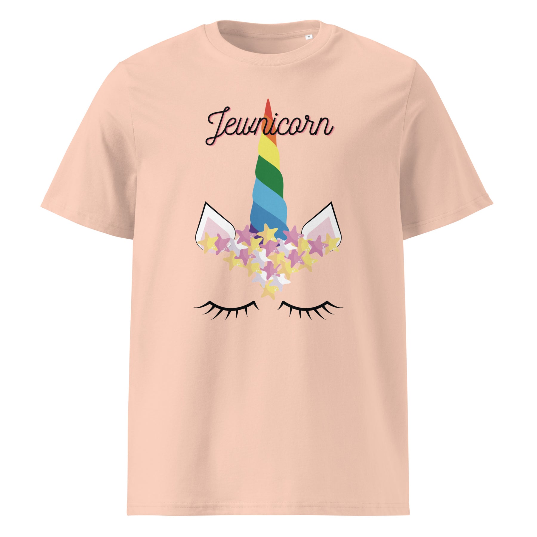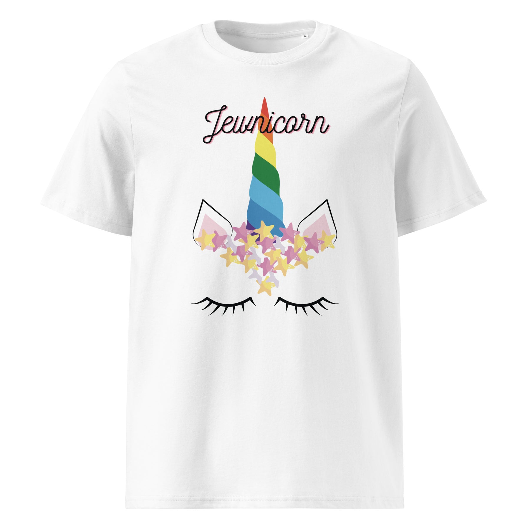Magically Jewish and eco-friendly? Yes, please. The Jewnicorn Organic Cotton T-Shirt blends whimsical design with sustainable comfort. Featuring a pastel rainbow unicorn horn, Stars of David, and sleepy lashes, this tee celebrates Jewish pride and playful identity in one bold, adorable package.