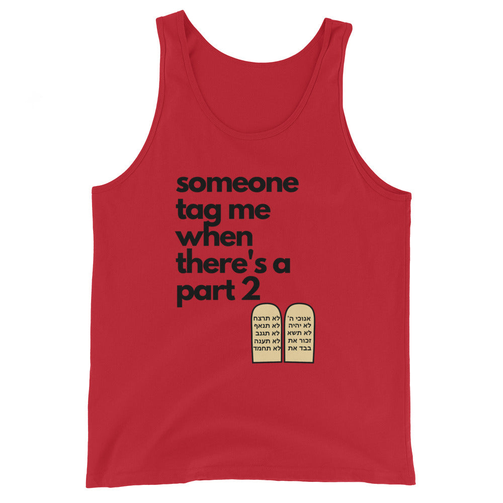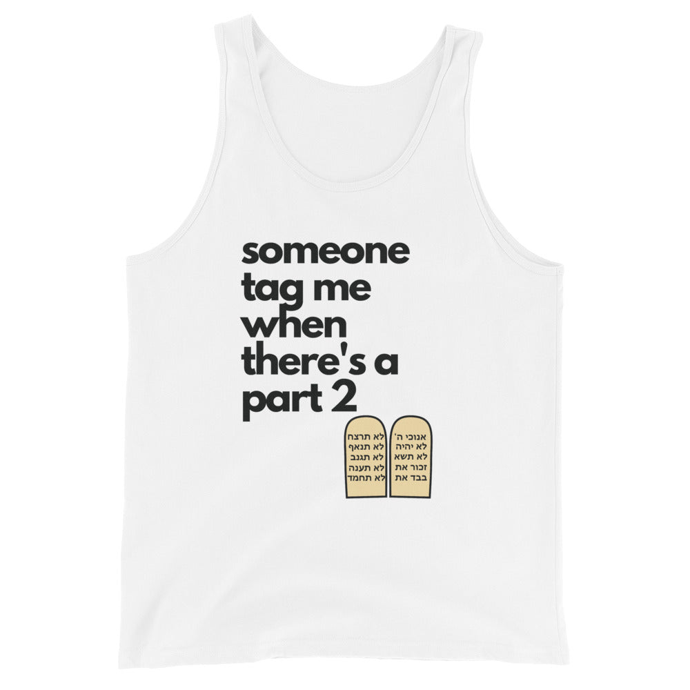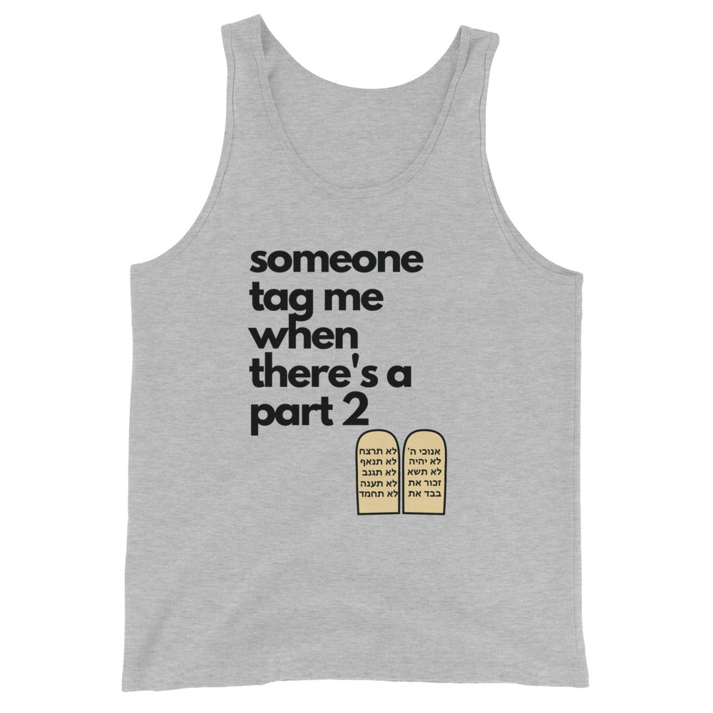 Across the front is the bold line “someone tag me when there’s a part 2”, paired with the Ten Commandments tablets written in Hebrew. It’s clever, unexpected, and instantly gets a smile. Whether you’re at the gym, the beach, a barbecue, or just running errands, this tank adds personality without trying too hard.