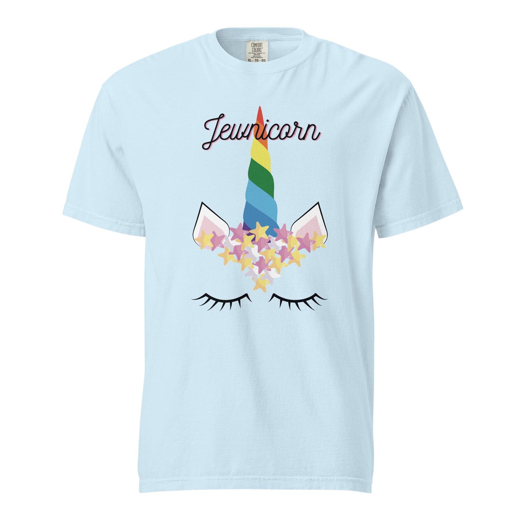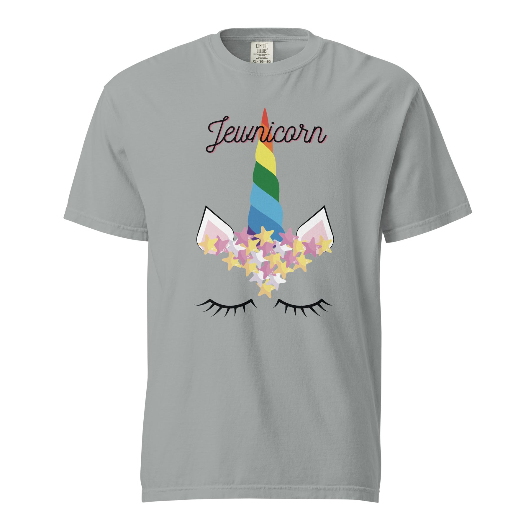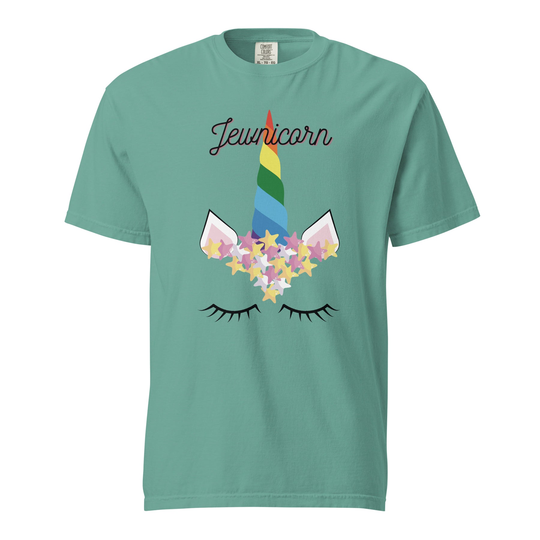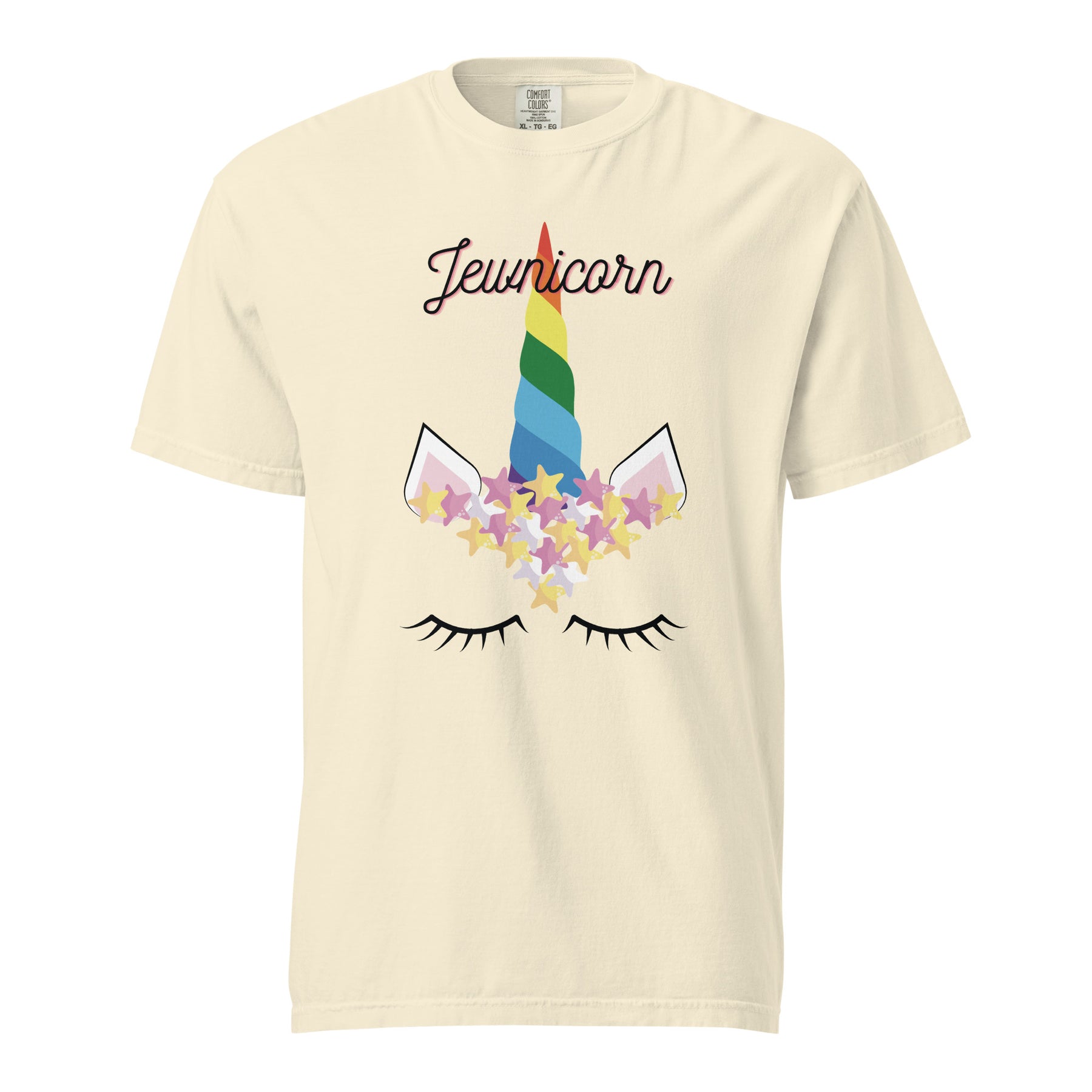 Add some serious charm and cheeky pride to your wardrobe with the Jewnicorn Garment-Dyed Heavyweight T-Shirt. This comfy, durable tee features a colorful rainbow horn, sleepy lashes, and pastel Stars of David, blending Jewish identity with unicorn-level magic.