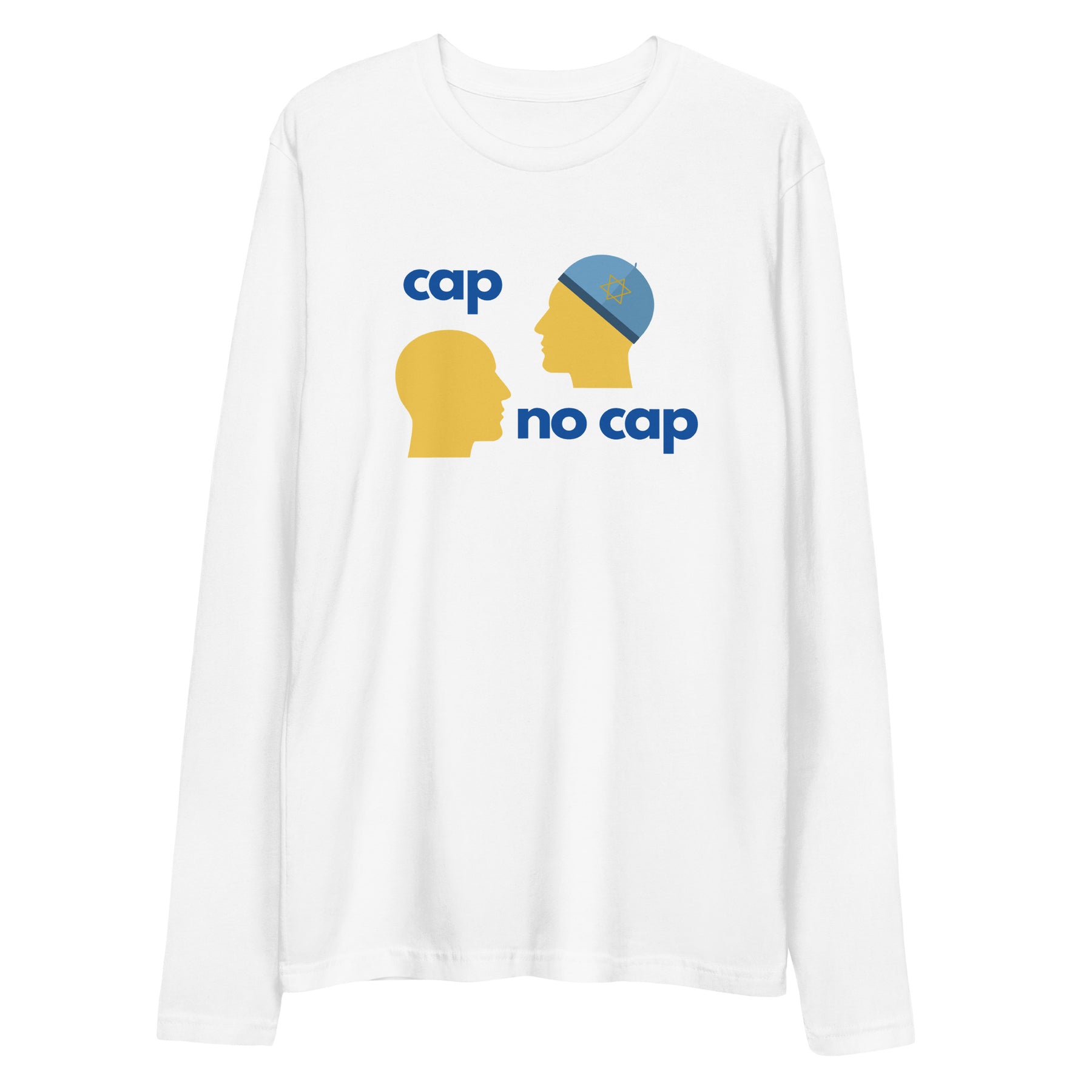 Clean lines. No cap energy. The Cap No Cap Long Sleeve Fitted Crew turns a phrase everyone knows into a smart Jewish visual joke. Cap on, cap off, the truth stays the same. Simple, confident, and instantly understood.