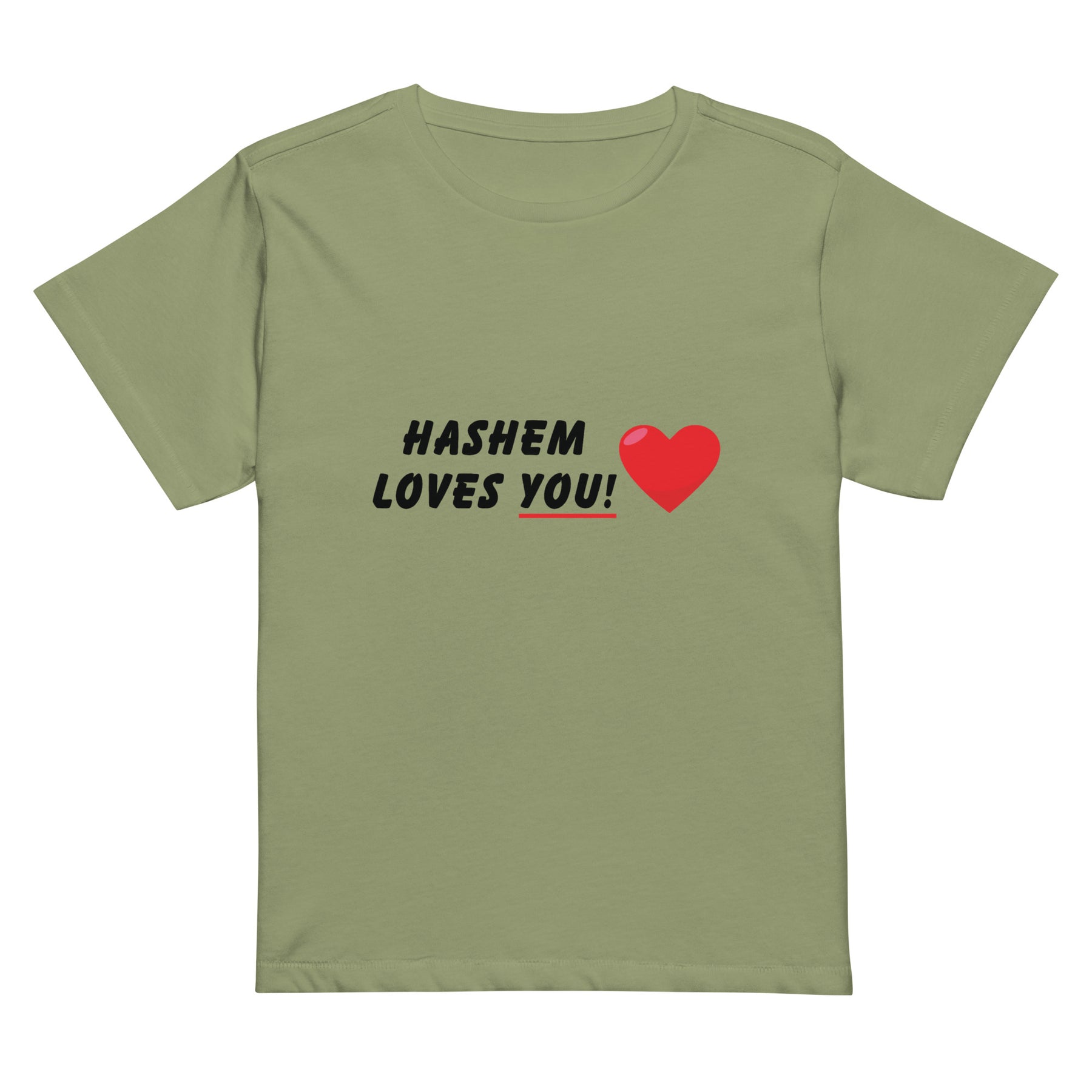 This “HaShem Loves You” high-waisted women’s t-shirt brings together Jewish faith, feminine strength, and elevated style. With a flattering cropped cut and empowering message, it’s the perfect blend of modest confidence and modern flair.