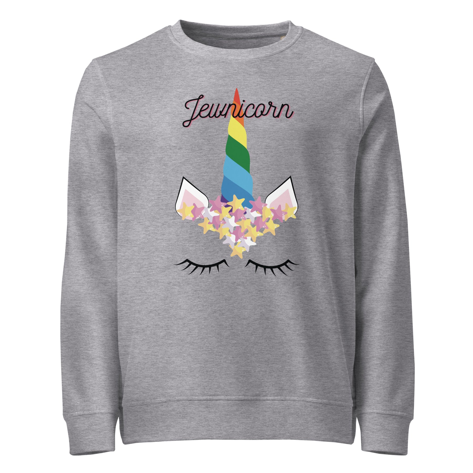 Stay warm, cozy, and confidently kosher in this Jewnicorn Organic Sweatshirt — a magical blend of eco-conscious comfort and Jewish pride. Featuring a playful unicorn with a Star of David, this sustainably made sweatshirt is perfect for celebrating your heritage with humor and heart. Whether it’s a Hanukkah gift, Shabbat outfit, or your go-to chillwear, this piece brings together comfort, identity, and mythical charm.