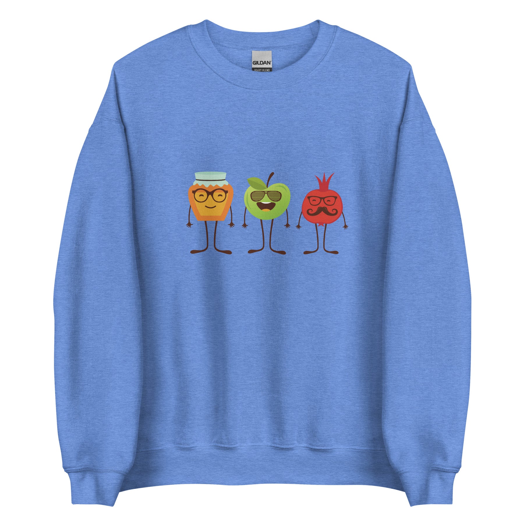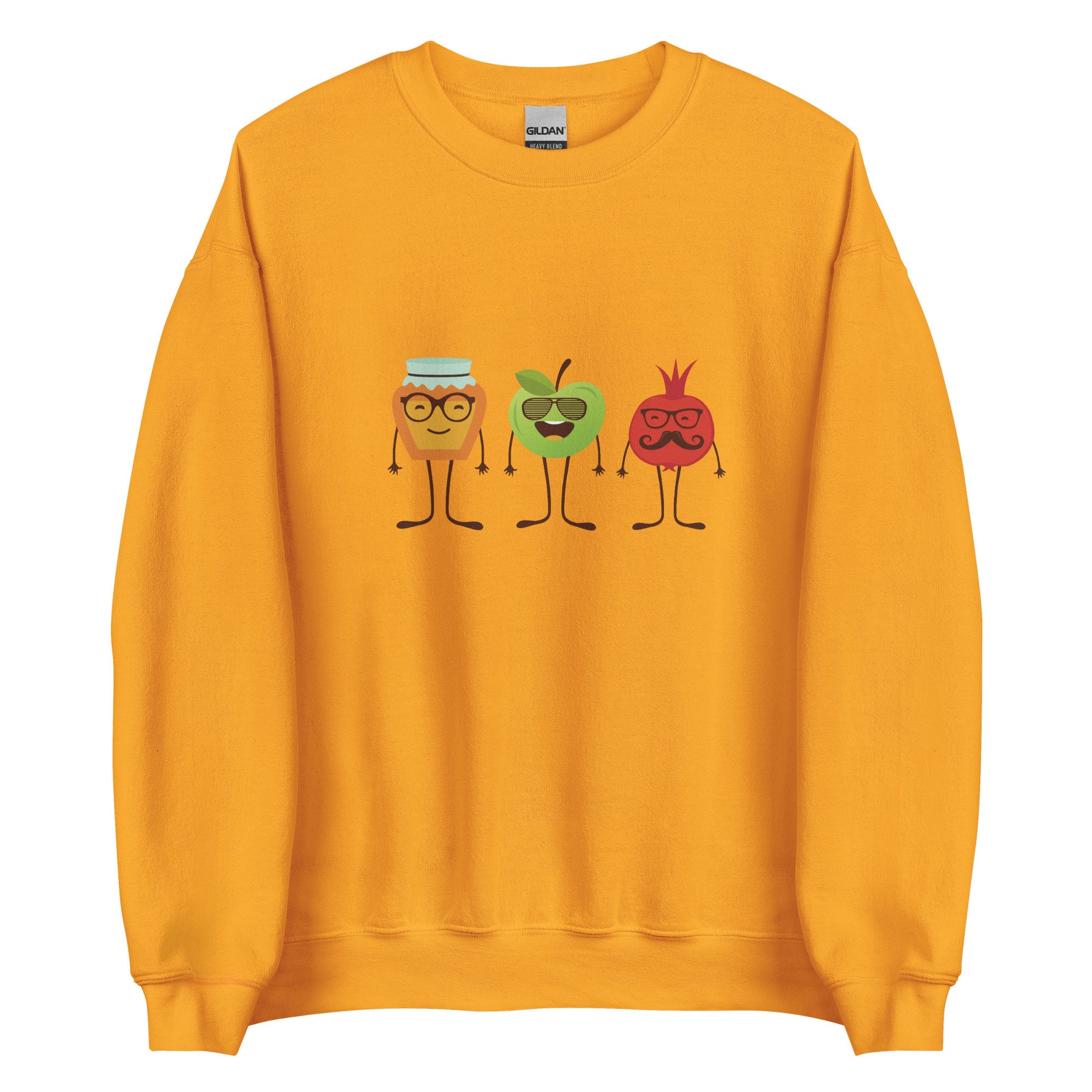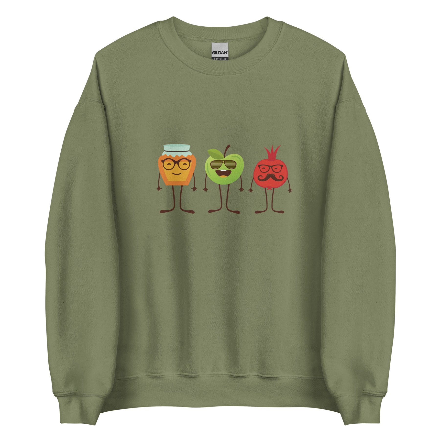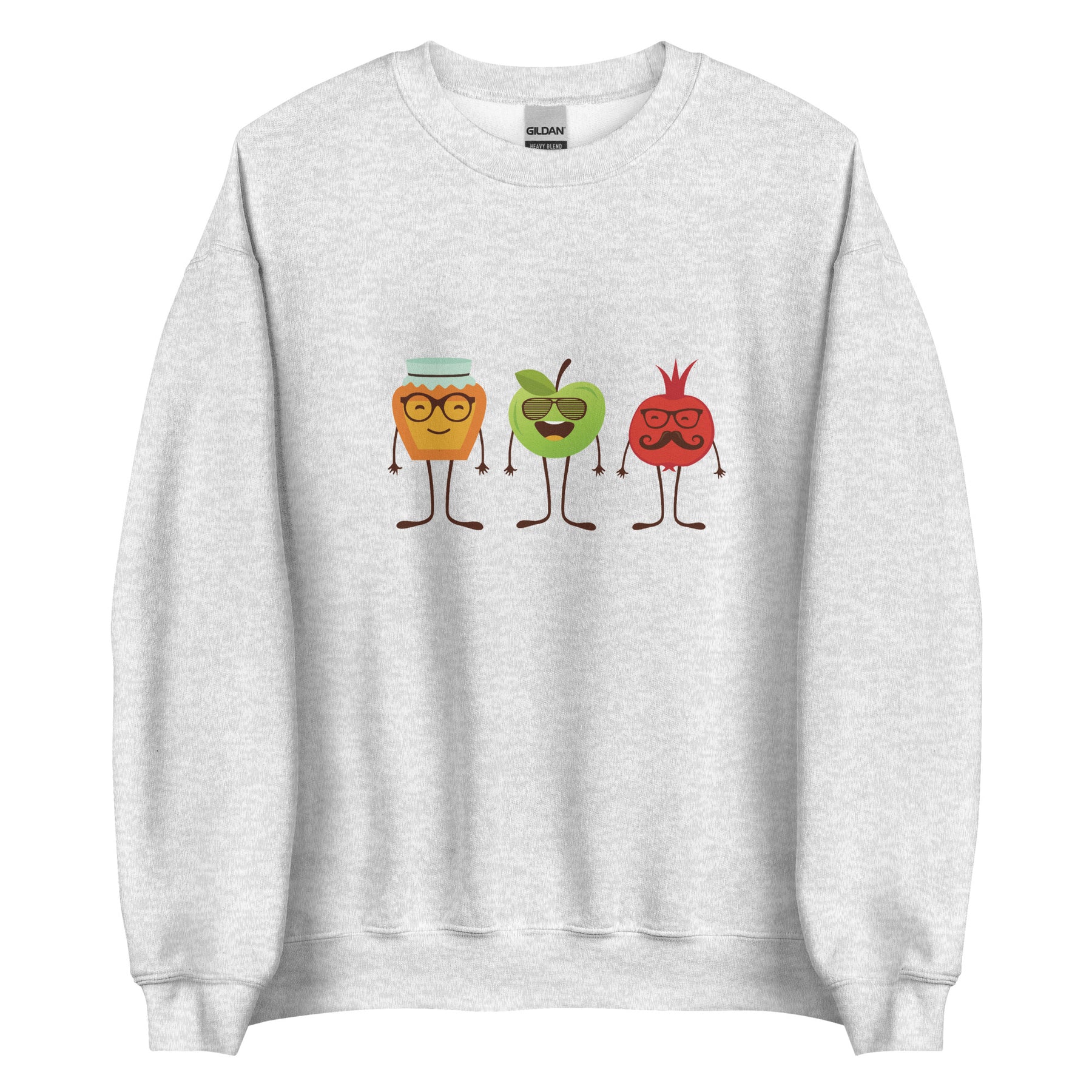 The sweatshirt feels soft on the inside and smooth on the outside, making it perfect for family dinners, synagogue events, school celebrations, or just getting into the holiday mood. The print stays bright after many washes, so your honey–apple–pomegranate trio keeps its charm year after year.