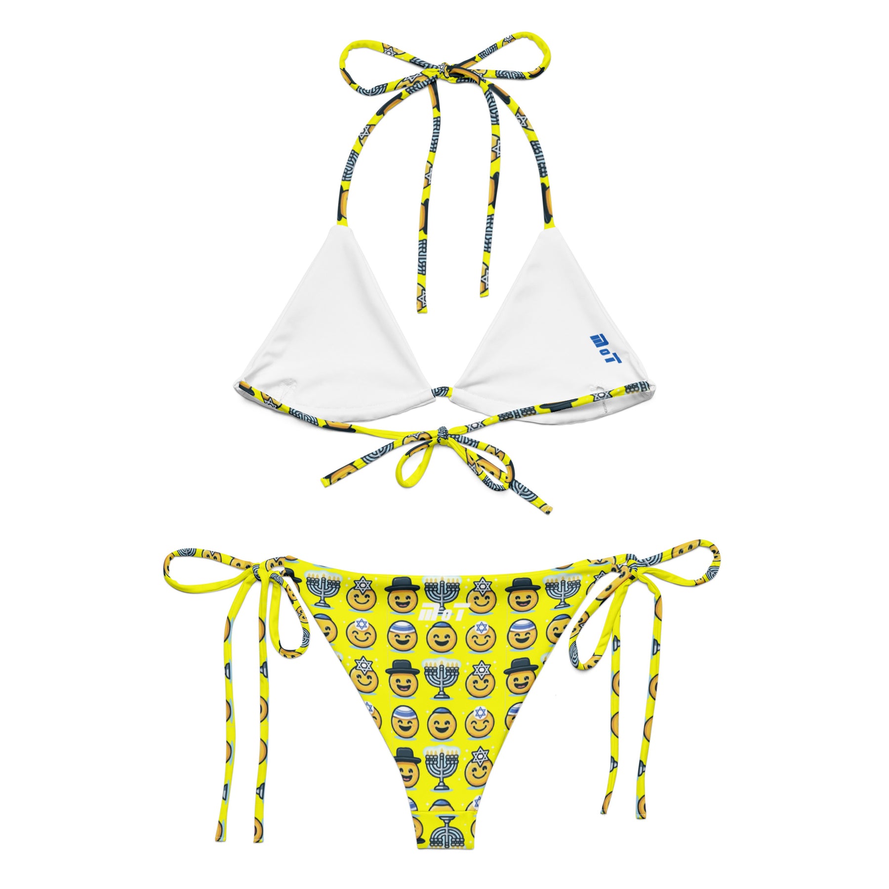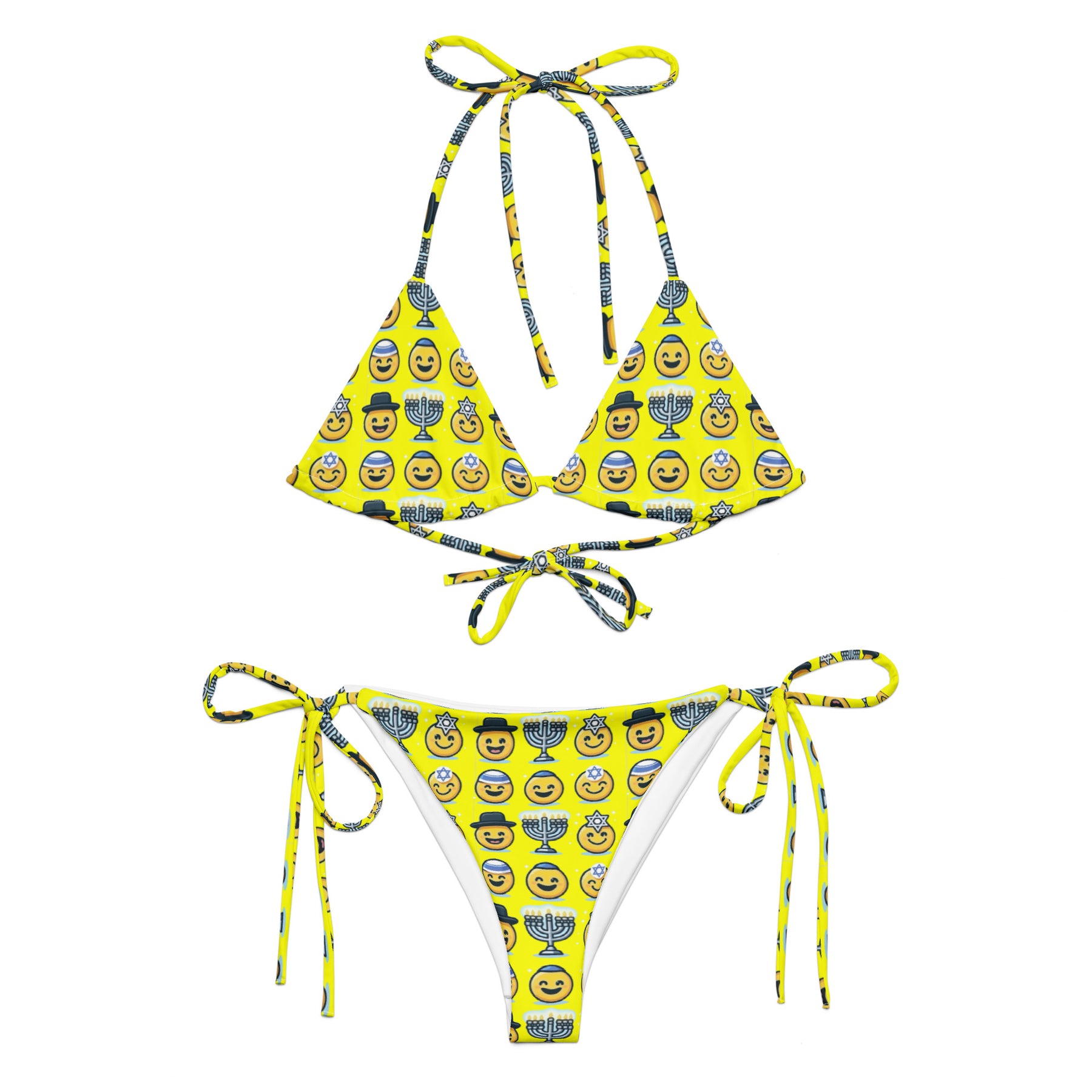 Make a splash with our Recycled String Bikini in Jewish Emoji All Over Print! 🌊👙 Show off your Jewish pride with every emoji. Eco-friendly, stylish, and perfect for sunny days by the water. Dive into sustainable fashion! ✡️♻️