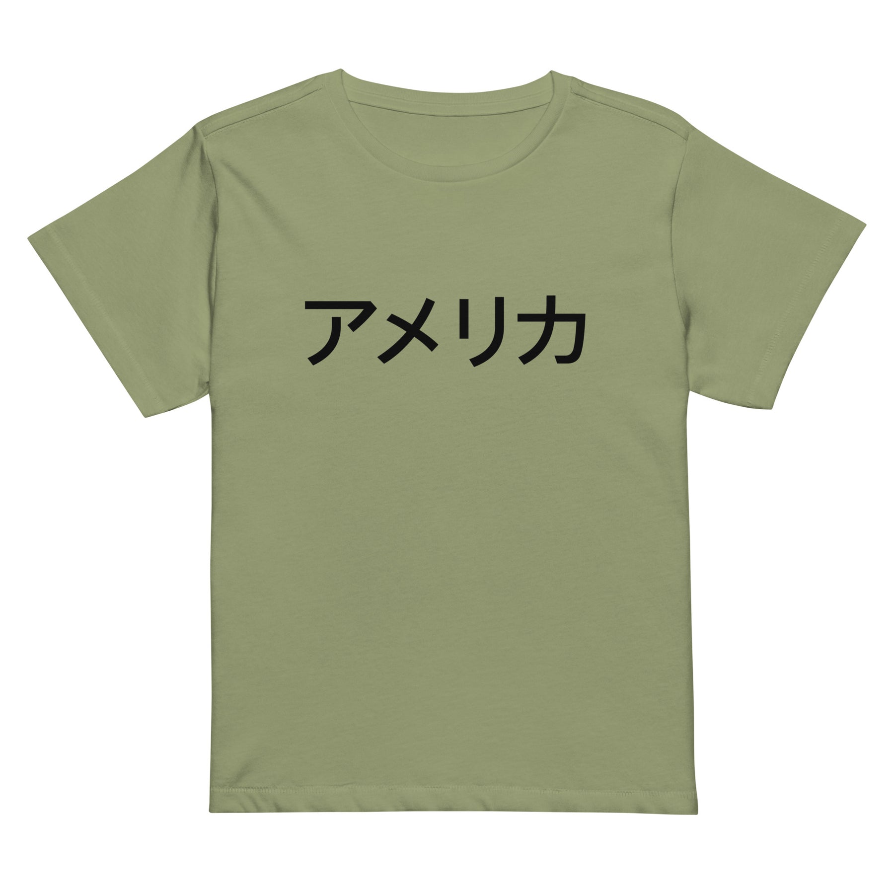 The アメリカ (America) Women’s High Waisted T-Shirt pairs bold Japanese katakana typography with a flattering, modern silhouette. The word “America” is printed simply and confidently, creating a design that feels global, minimal, and effortlessly stylish.