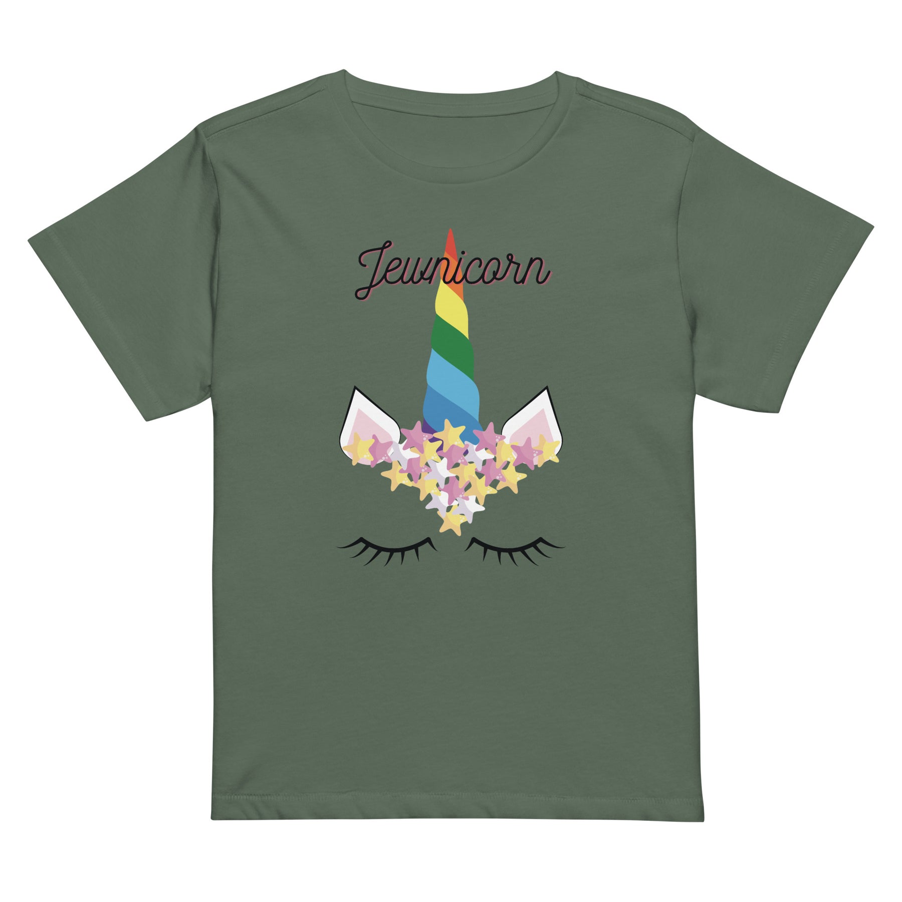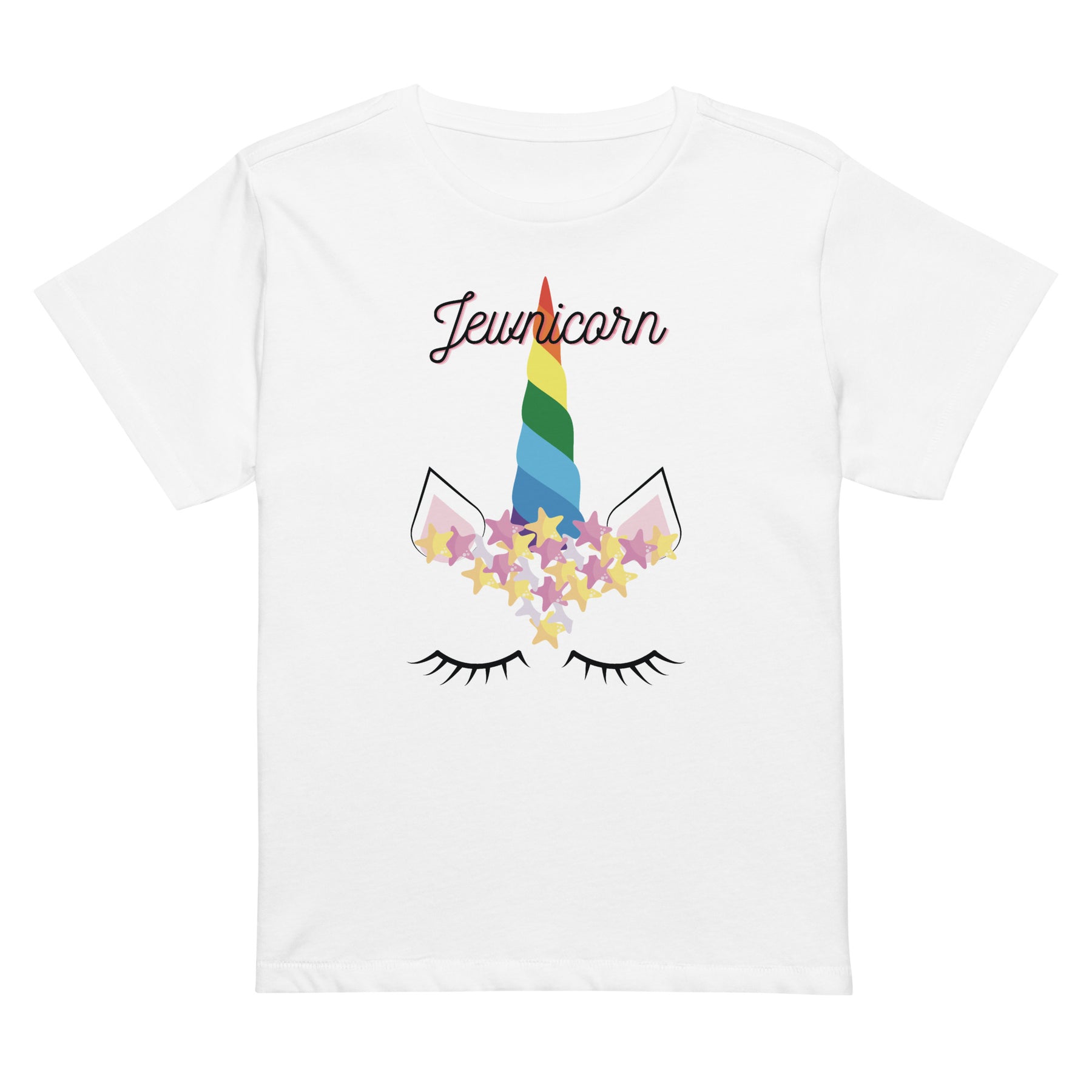Unleash your sparkle with the Jewnicorn High-Waisted Tee — where Jewish pride meets magical vibes. This flattering crop-style shirt is made for bold women who love to stand out. Featuring a unicorn decked out with a Star of David, it’s a fun twist on tradition and identity.
