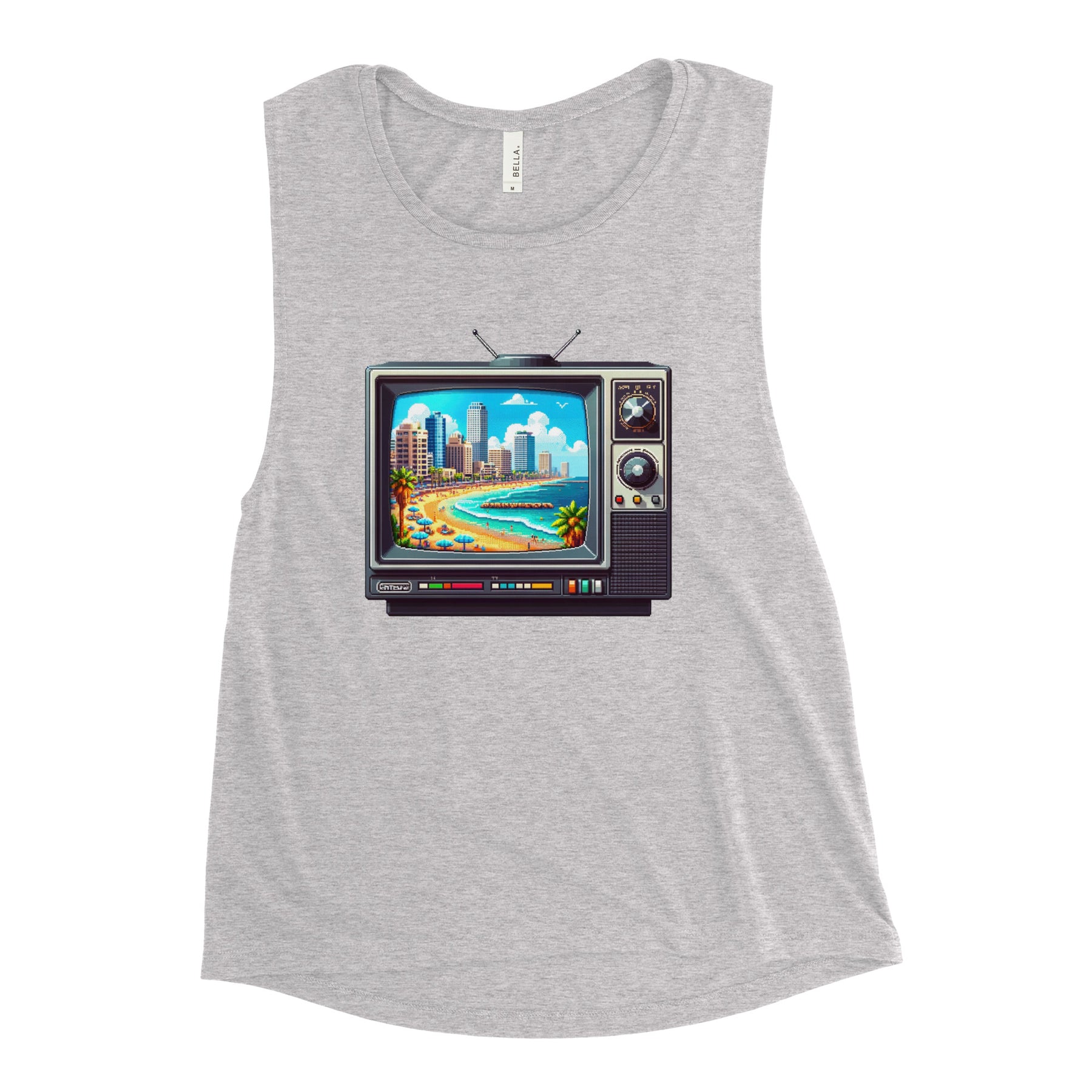 Slip into nostalgia with our Ladies’ Muscle Tank | 16Bit Tel Aviv Beach design. Featuring Tel Aviv in a retro 16-bit style on a vintage TV screen. 🏖️🎮 #TelAvivVibes #RetroCool #emohtee #MoT