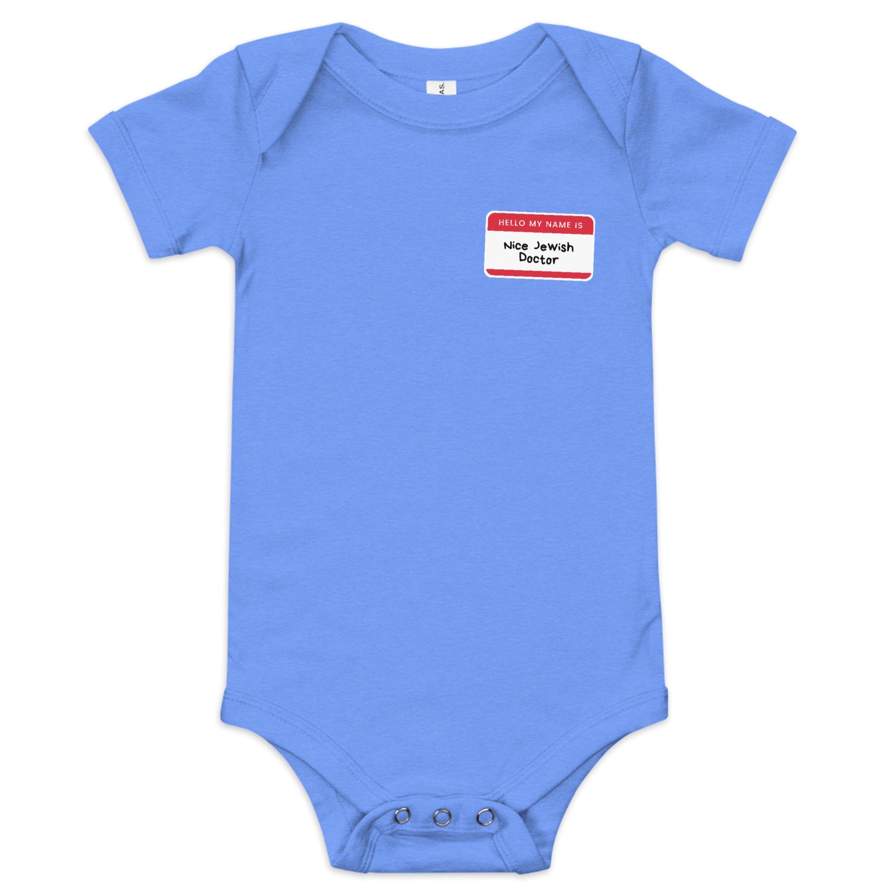 The Nice Jewish Doctor Baby Short Sleeve One Piece brings classic Jewish humor to the very beginning of life. Styled like a familiar name tag, the message says exactly what generations of parents and grandparents are already thinking. No pressure. Just tradition… and love.